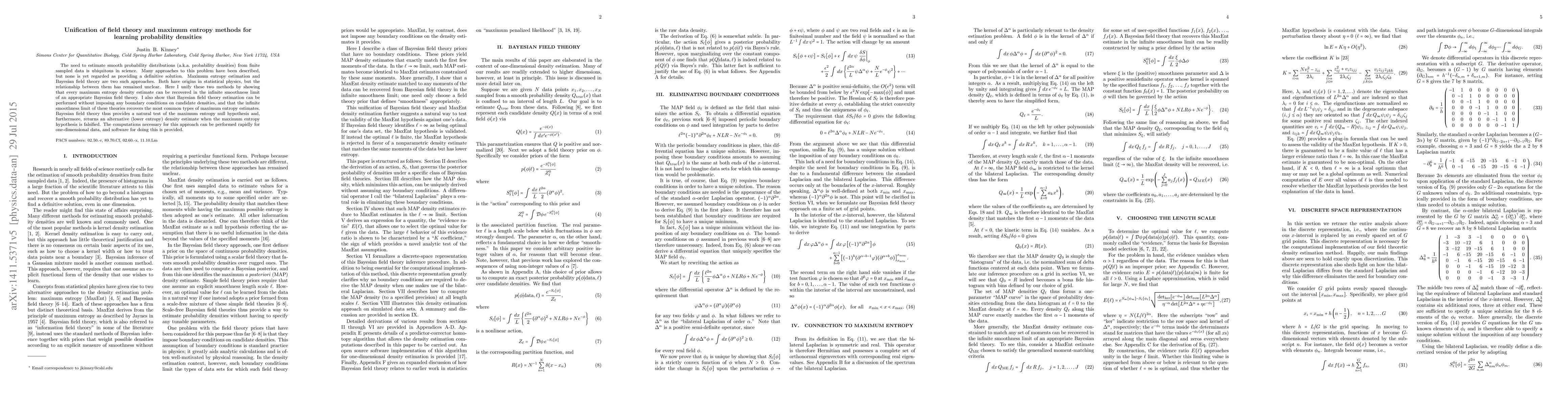 This paper unifies maximum entropy methods and Bayesian field theory for estimating probability densities, demonstrating that maximum entropy estimates can be derived from the infinite smoothness limit of Bayesian field theory. It argues that Bayesian field theory offers a definitive solution for one-dimensional density estimation, providing a robust alternative to traditional methods.