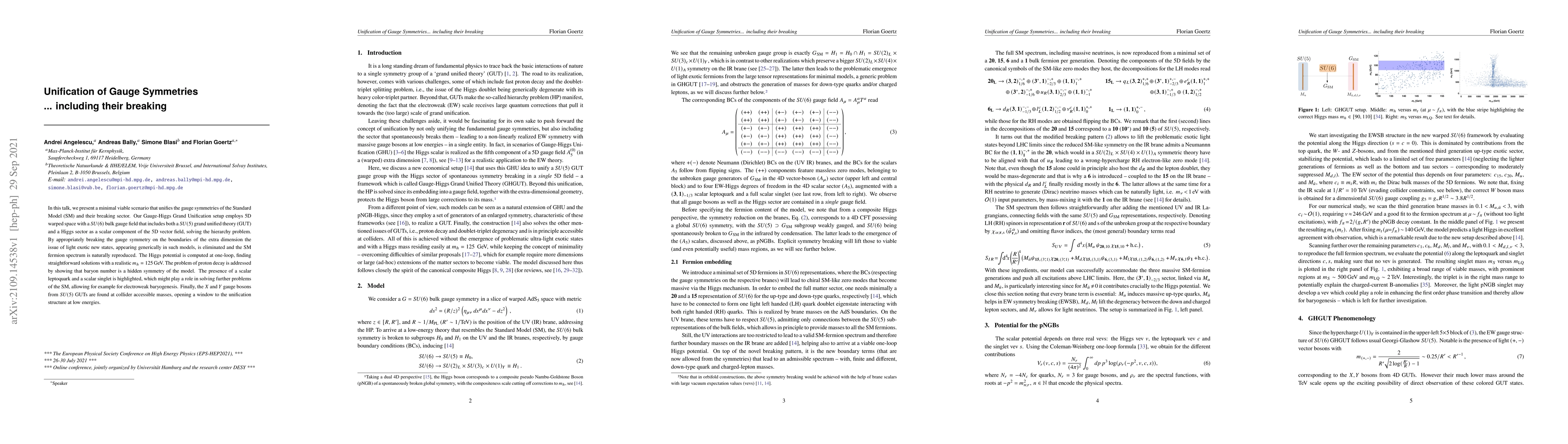 In this talk, we present a minimal viable scenario that unifies the gauge symmetries of the Standard Model (SM) and their breaking sector. Our Gauge-Higgs Grand Unification setup employs 5D warped space with a $SU(6)$ bulk gauge field that includes both a $SU(5)$ grand unified theory (GUT) and a Higgs sector as a scalar component of the 5D vector field, solving the hierarchy problem. By appropriately breaking the gauge symmetry on the boundaries of the extra dimension the issue of light exotic new states, appearing generically in such models, is eliminated and the SM fermion spectrum is naturally reproduced. The Higgs potential is computed at one-loop, finding straightforward solutions with a realistic $m_h = 125$ GeV. The problem of proton decay is addressed by showing that baryon number is a hidden symmetry of the model. The presence of a scalar leptoquark and a scalar singlet is highlighted, which might play a role in solving further problems of the SM, allowing for example for electroweak baryogenesis. Finally, the $X$ and $Y$ gauge bosons from $SU(5)$ GUTs are found at collider accessible masses, opening a window to the unification structure at low energies.