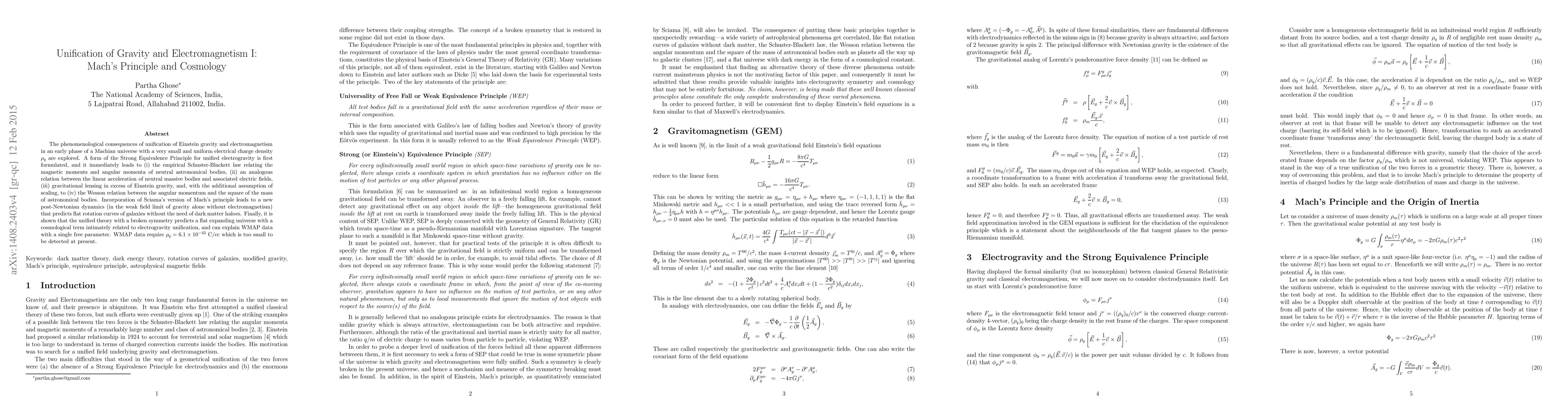 The phenomenological consequences of unification of Einstein gravity and electromagnetism in an early phase of a Machian universe with a very small and uniform electrical charge density $\rho_q$ are explored. A form of the Strong Equivalence Principle for unified electrogravity is first formulated, and it immediately leads to (i) the empirical Schuster-Blackett law relating the magnetic moments and angular momenta of neutral astronomical bodies, (ii) an analogous relation between the linear acceleration of neutral massive bodies and associated electric fields, (iii) gravitational lensing in excess of Einstein gravity, and, with the additional assumption of scaling, to (iv) the Wesson relation between the angular momentum and the square of the mass of astronomical bodies. Incorporation of Sciama's version of Mach's principle leads to a new post-Newtonian dynamics (in the weak field limit of gravity alone without electromagnetism) that predicts flat rotation curves of galaxies without the need of dark matter haloes. Finally, it is shown that the unified theory with a broken symmetry predicts a flat expanding universe with a cosmological term intimately related to electrogravity unification, and can explain WMAP data with a single free parameter. WMAP data require $\rho_q =6.1\times 10^{-43}$ C/cc which is too small to be detected at