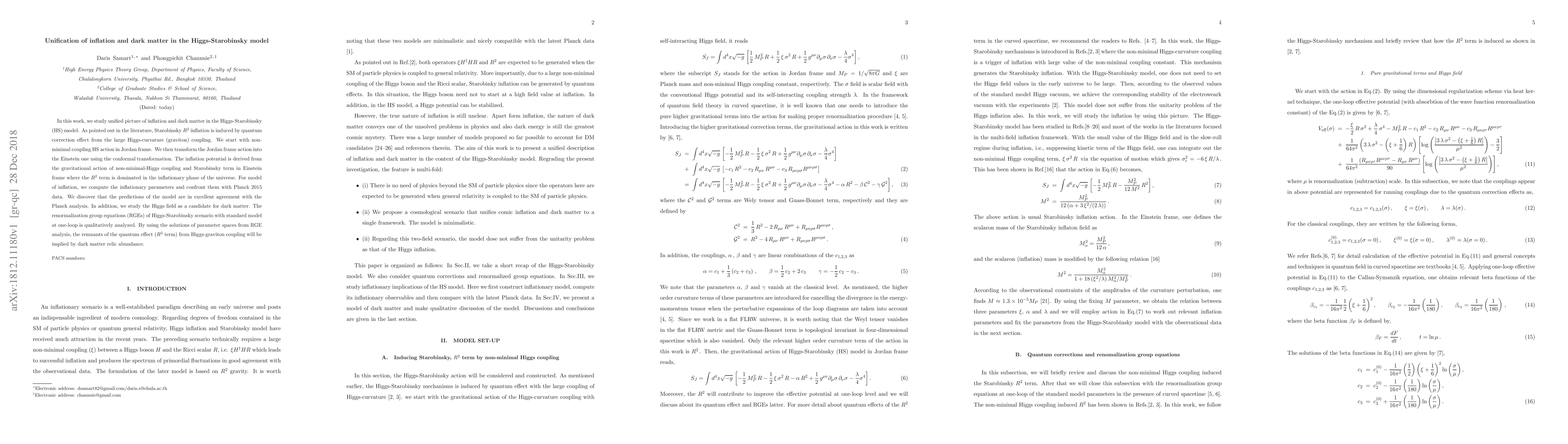 This paper explores the Higgs-Starobinsky model to unify inflation and dark matter, deriving an inflation potential from a non-minimal Higgs coupling and a Starobinsky $R^2$ term, which agrees with Planck 2015 data. It further suggests the Higgs field as a dark matter candidate, with its relic abundance influenced by the quantum effect of the $R^2$ term.