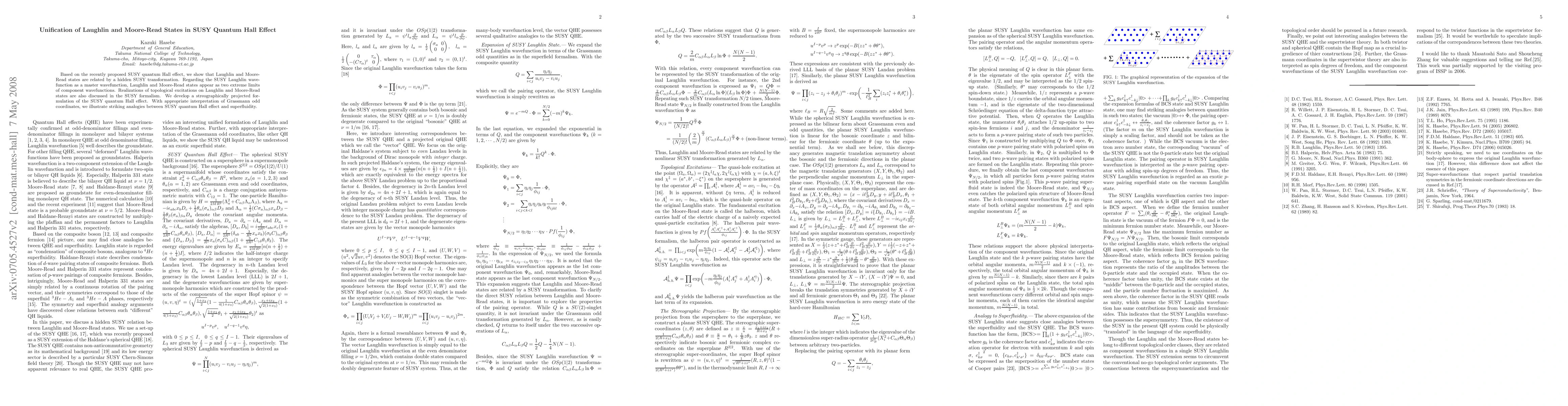This paper demonstrates a unification of Laughlin and Moore-Read states in the SUSY quantum Hall effect, revealing their connection through a hidden SUSY transformation. It establishes the SUSY Laughlin wavefunction as a master function, showing how the two states emerge as distinct limits, and explores topological excitations within this framework.