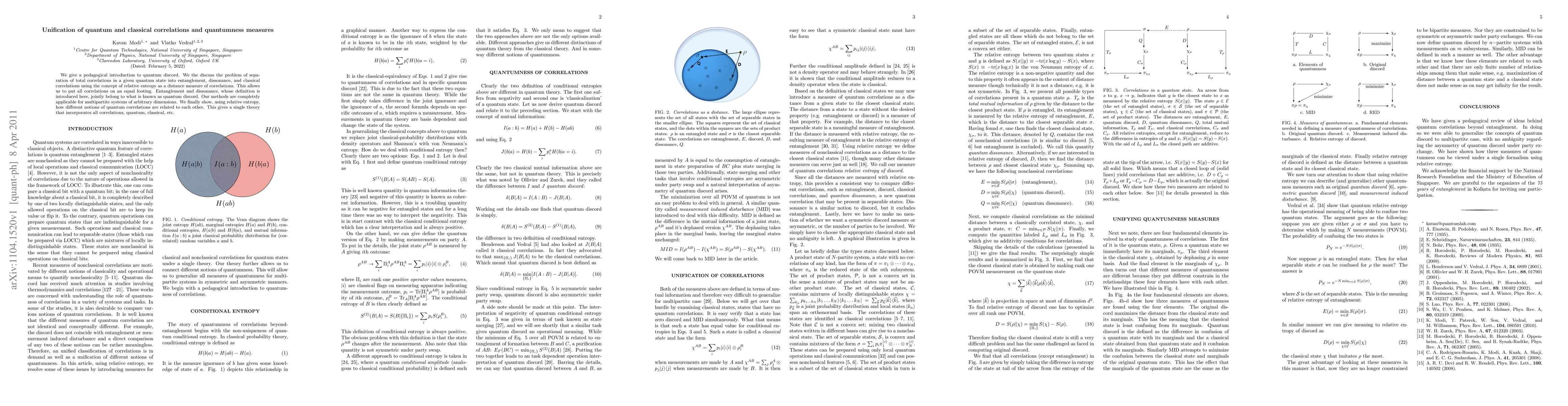 We give a pedagogical introduction to quantum discord. We the discuss the problem of separation of total correlations in a given quantum state into entanglement, dissonance, and classical correlations using the concept of relative entropy as a distance measure of correlations. This allows us to put all correlations on an equal footing. Entanglement and dissonance, whose definition is introduced here, jointly belong to what is known as quantum discord. Our methods are completely applicable for multipartite systems of arbitrary dimensions. We finally show, using relative entropy, how different notions of quantum correlations are related to each other. This gives a single theory that incorporates all correlations, quantum, classical, etc.