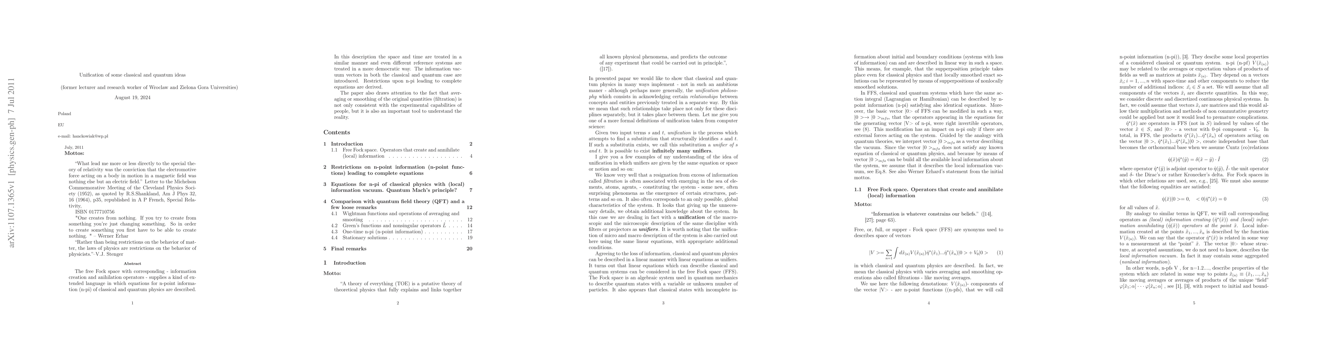 The free Fock space with corresponding - information creation and anihilation operators - supplies a kind of extended language in which equations for n-point information (n-pi) of classical and quantum physics are described. In this description the space and time are treated in a similar manner and even different reference systems are treated in a more democratic way. The information vacuum vectors in both the classical and quantum case are introduced. Restrictions upon n-pi leading to complete equations are derived. The paper also draws attention to the fact that averaging or smoothing of the original quantities (filtration) is not only consistent with the experimental capabilities of people, but it is also an important tool to understand the reality.