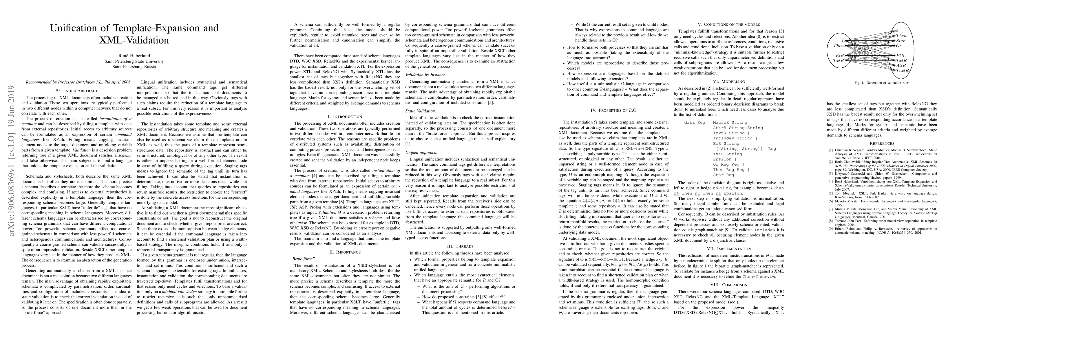 The processing of XML documents often includes creation and validation. These two operations are typically performed in two different nodes within a computer network that do not correlate with each other. The process of creation is also called instantiation of a template and can be described by filling a template with data from external repositories. Initial access to arbitrary sources can be formulated as an expression of certain command languages like XPath. Filling means copying invariant element nodes to the target document and unfolding variable parts from a given template. Validation is a descision problem returning true if a given XML document satisfies a schema and false otherwise. The main subject is to find a language that unions the template expansion and the validation. [..].