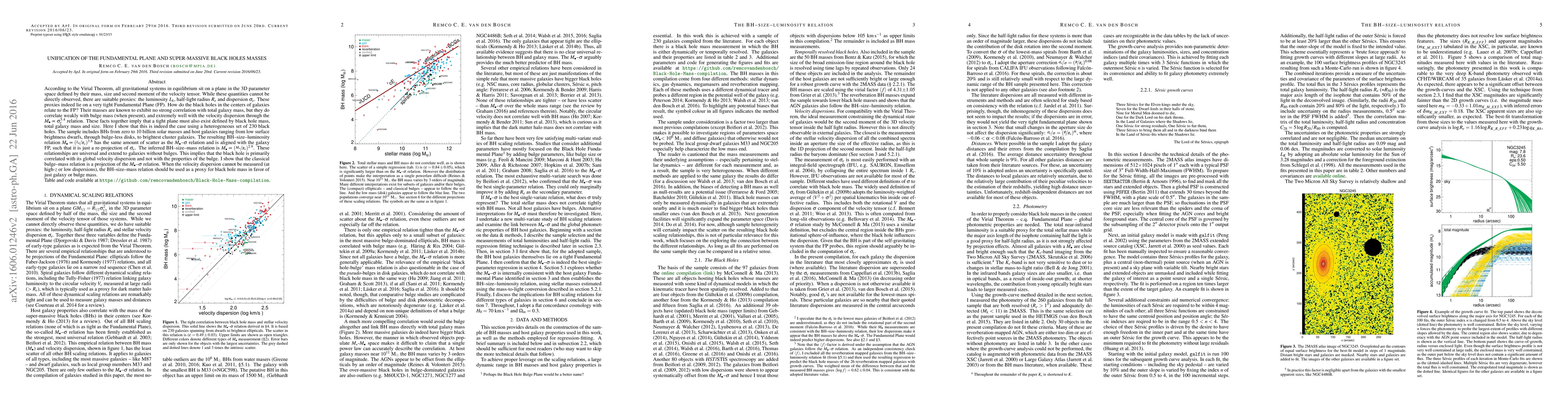 According to the Virial Theorem, all gravitational systems in equilibrium sit on a plane in the 3D parameter space defined by their mass, size and second moment of the velocity tensor. While these quantities cannot be directly observed, there are suitable proxies: the luminosity Lk, half-light radius Re and dispersion sigma_e. These proxies indeed lie on a very tight Fundamental Plane (FP). How do the black holes in the centers of galaxies relate to the FP? Their masses are known to exhibit no strong correlation with total galaxy mass, but they do correlate weakly with bulge mass (when present), and extremely well with the velocity dispersion through the Mbh = sigma_e^5.4 relation. These facts together imply that a tight plane must also exist defined by black hole mass, total galaxy mass and size. Here I show that this is indeed the case using a heterogeneous set of 230 black holes. The sample includes BHs from zero to 10 billion solar masses and host galaxies ranging from low surface brightness dwarfs, through bulge-less disks, to brightest cluster galaxies. The resulting BH-size-luminosity Mbh=(Lk/Re)^3.8 has the same amount of scatter as the M-sigma relation and is aligned with the galaxy FP, such that it is just a re-projection of sigma. The inferred BH-size-mass relation is Mbh=(M_star/Re)^2.9. These relationships are universal and extend to galaxies without bulges. This implies that the black hole is primarily correlated with its global velocity dispersion and not with the properties of the bulge. I show that the classical bulge--mass relation is a projection of the M-sigma relation. When the velocity dispersion cannot be measured (at high-z or low dispersions), the BH-size-mass relation should be used as a proxy for black hole mass in favor of just galaxy or bulge mass.