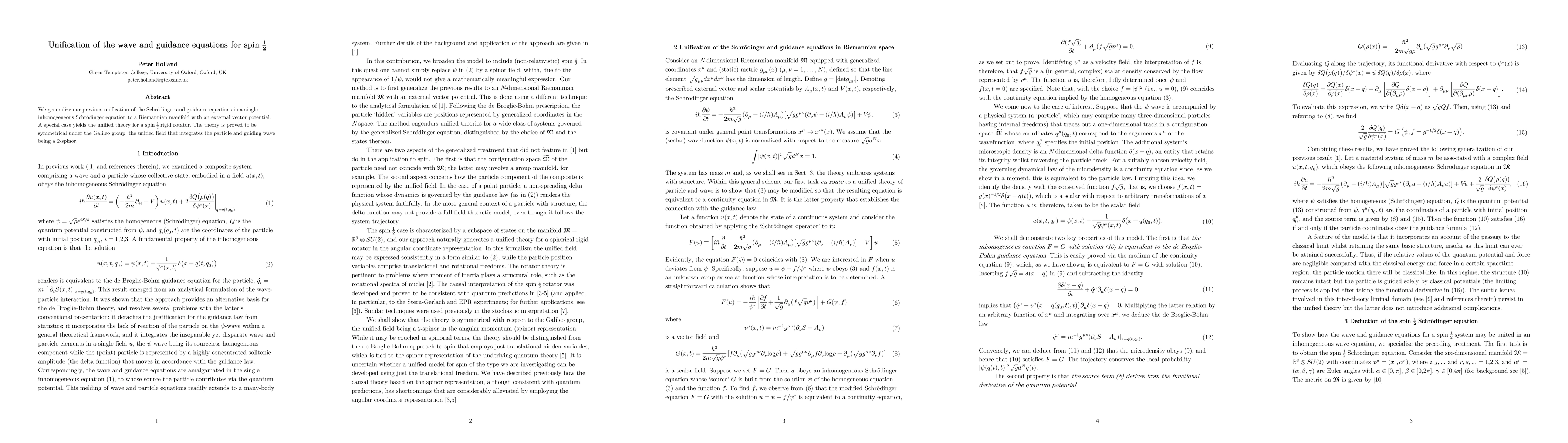 We generalize our previous unification of the Schrodinger and guidance equations in a single inhomogeneous Schrodinger equation to a Riemannian manifold with an external vector potential. A special case yields the unified theory for a spin 1/2 rigid rotator. The theory is proved to be symmetrical under the Galileo group, the unified field that integrates the particle and guiding wave being a 2-spinor.