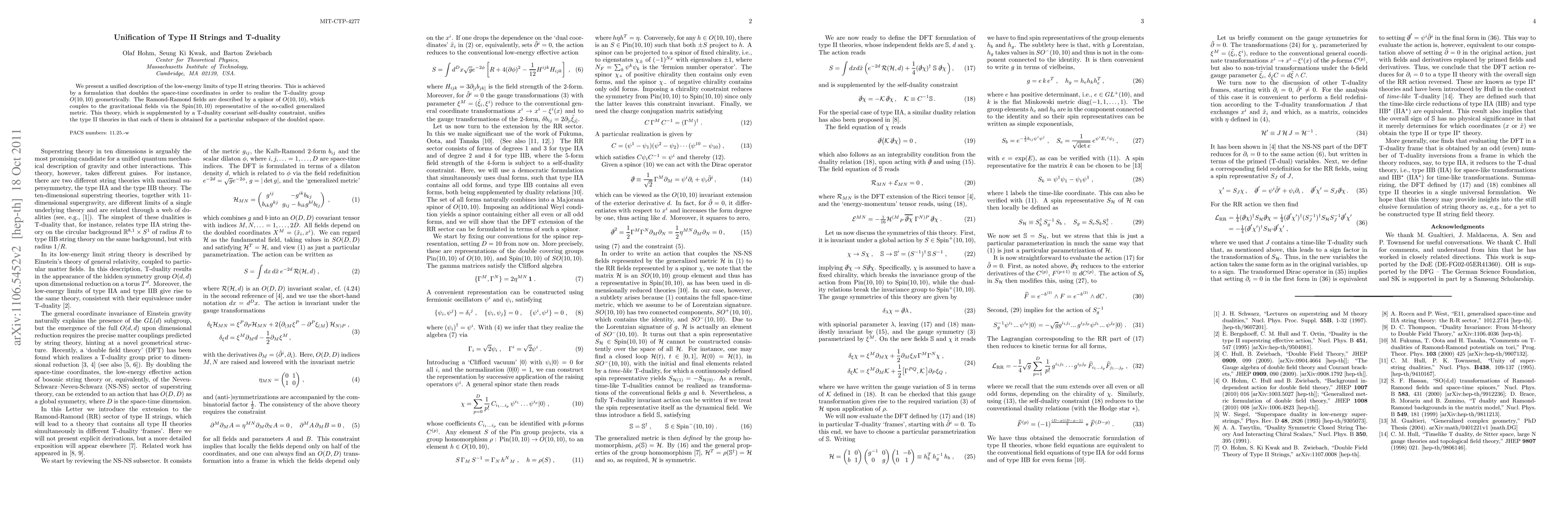 This paper proposes a unified description of type II string theories by doubling space-time coordinates to achieve T-duality group O(10,10) geometrically, unifying the theories through a spinor field that couples with gravitational fields.