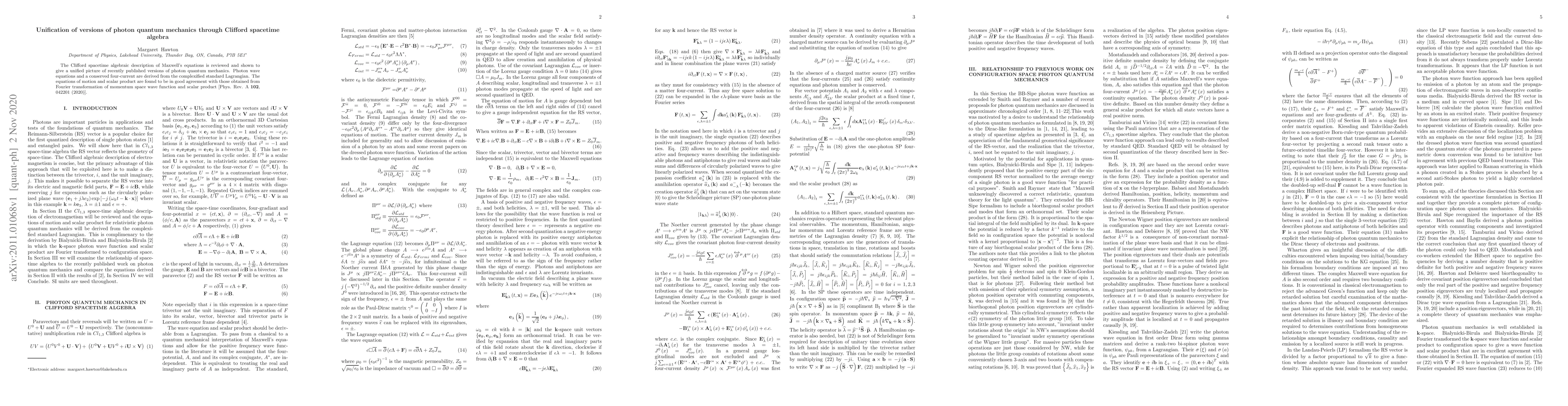 The Clifford spacetime algebraic description of Maxwell's equations is reviewed and shown to give a unified picture of recently published versions of photon quantum mechanics. Photon wave equations and a conserved four-current are derived from the complexified standard Lagrangian. The equations of motion and scalar product are found to be in good agreement with those obtained from Fourier transformation of momentum space wave function and scalar product [Phys. Rev. A 102, 042201 (2020)].