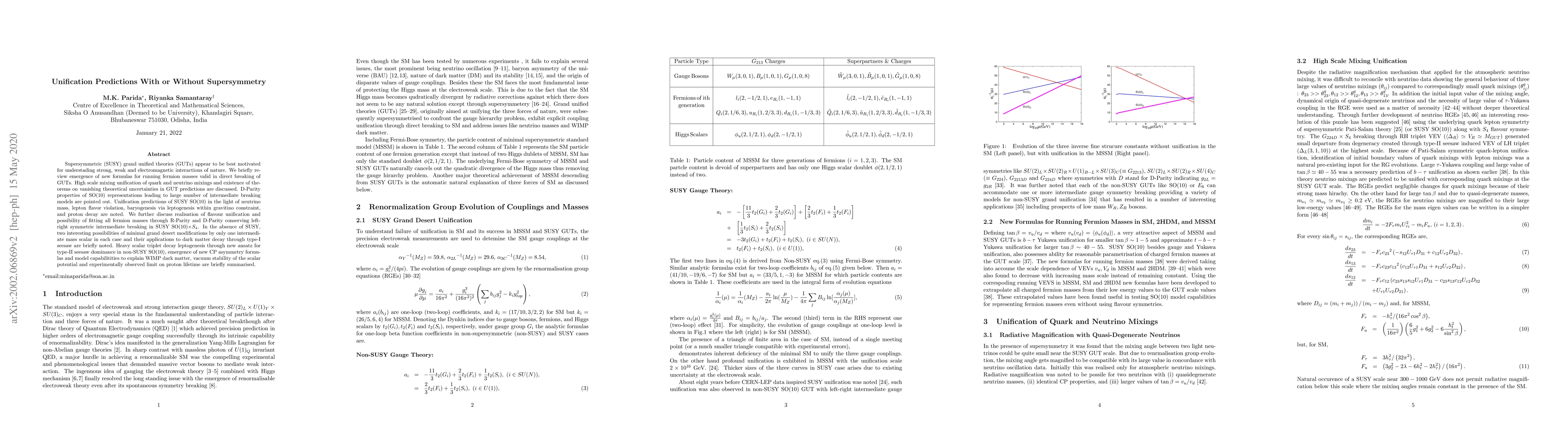 This paper discusses unification predictions with and without supersymmetry in grand unified theories (GUTs), exploring the implications for particle masses, neutrino mass, dark matter, and proton decay.