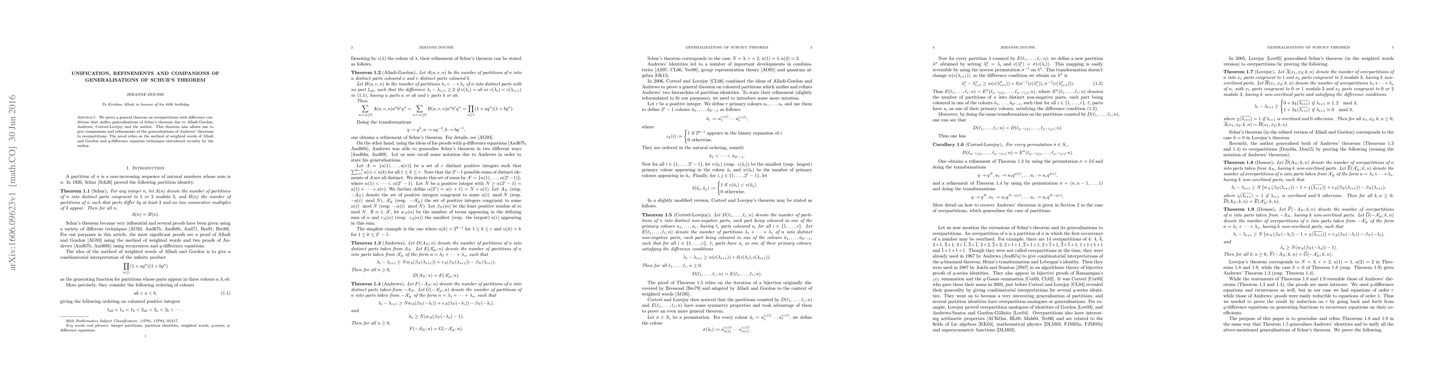 This paper unifies various generalizations of Schur's theorem on overpartitions using a new general theorem with difference conditions, and introduces companions and refinements for these generalizations, employing weighted words and $q$-difference equation techniques.