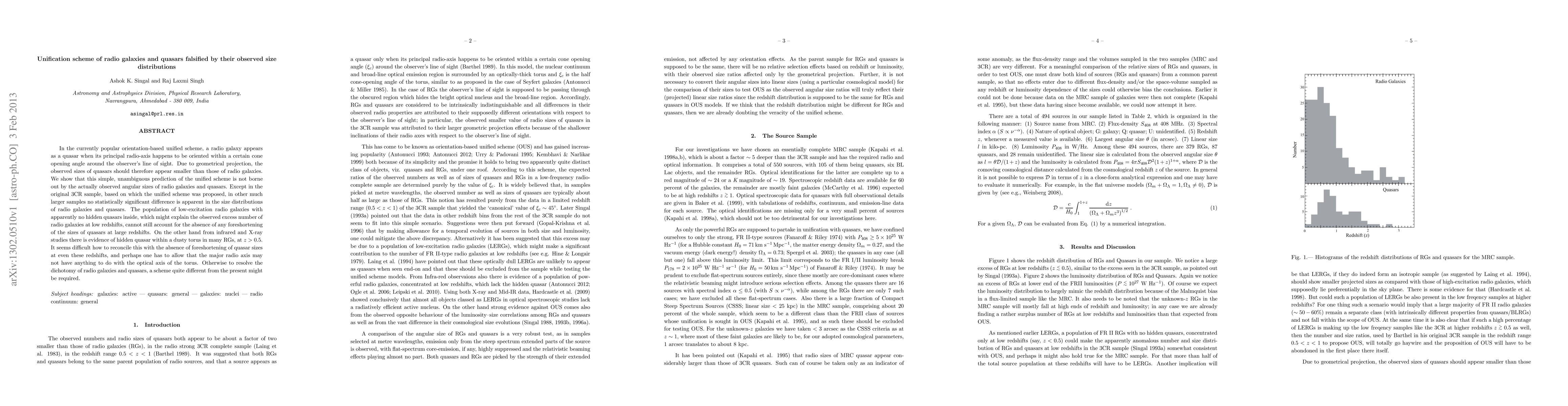 In the currently popular orientation-based unified scheme, a radio galaxy appears as a quasar when its principal radio-axis happens to be oriented within a certain cone opening angle around the observer's line of sight. Due to geometrical projection, the observed sizes of quasars should therefore appear smaller than those of radio galaxies. We show that this simple, unambiguous prediction of the unified scheme is not borne out by the actually observed angular sizes of radio galaxies and quasars. Except in the original 3CR sample, based on which the unified scheme was proposed, in other much larger samples no statistically significant difference is apparent in the size distributions of radio galaxies and quasars. The population of low-excitation radio galaxies with apparently no hidden quasars inside, which might explain the observed excess number of radio galaxies at low redshifts, cannot still account for the absence of any foreshortening of the sizes of quasars at large redshifts. On the other hand from infrared and X-ray studies there is evidence of hidden quasar within a dusty torus in many RGs, at $z>0.5$. It seems difficult how to reconcile this with the absence of foreshortening of quasar sizes at even these redshifts, and perhaps one has to allow that the major radio axis may not have anything to do with the optical axis of the torus. Otherwise to resolve the dichotomy of radio galaxies and quasars, a scheme quite different from the present might be required.