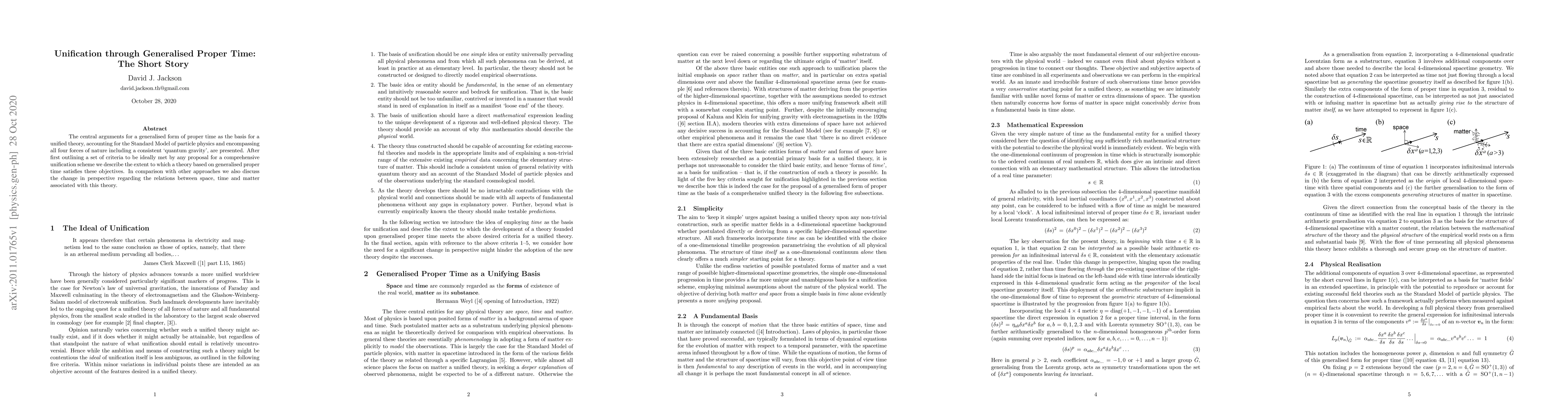 The central arguments for a generalised form of proper time as the basis for a unified theory, accounting for the Standard Model of particle physics and encompassing all four forces of nature including a consistent `quantum gravity', are presented. After first outlining a set of criteria to be ideally met by any proposal for a comprehensive unification scheme we describe the extent to which a theory based on generalised proper time satisfies these objectives. In comparison with other approaches we also discuss the change in perspective regarding the relations between space, time and matter associated with this theory.