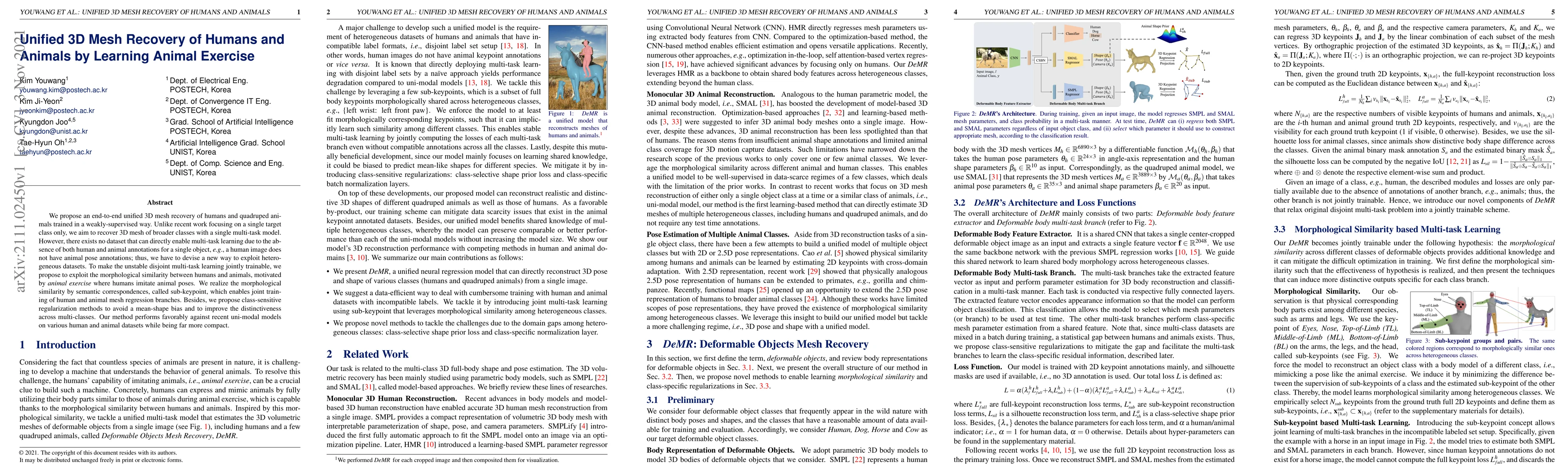 We propose an end-to-end unified 3D mesh recovery of humans and quadruped animals trained in a weakly-supervised way. Unlike recent work focusing on a single target class only, we aim to recover 3D mesh of broader classes with a single multi-task model. However, there exists no dataset that can directly enable multi-task learning due to the absence of both human and animal annotations for a single object, e.g., a human image does not have animal pose annotations; thus, we have to devise a new way to exploit heterogeneous datasets. To make the unstable disjoint multi-task learning jointly trainable, we propose to exploit the morphological similarity between humans and animals, motivated by animal exercise where humans imitate animal poses. We realize the morphological similarity by semantic correspondences, called sub-keypoint, which enables joint training of human and animal mesh regression branches. Besides, we propose class-sensitive regularization methods to avoid a mean-shape bias and to improve the distinctiveness across multi-classes. Our method performs favorably against recent uni-modal models on various human and animal datasets while being far more compact.