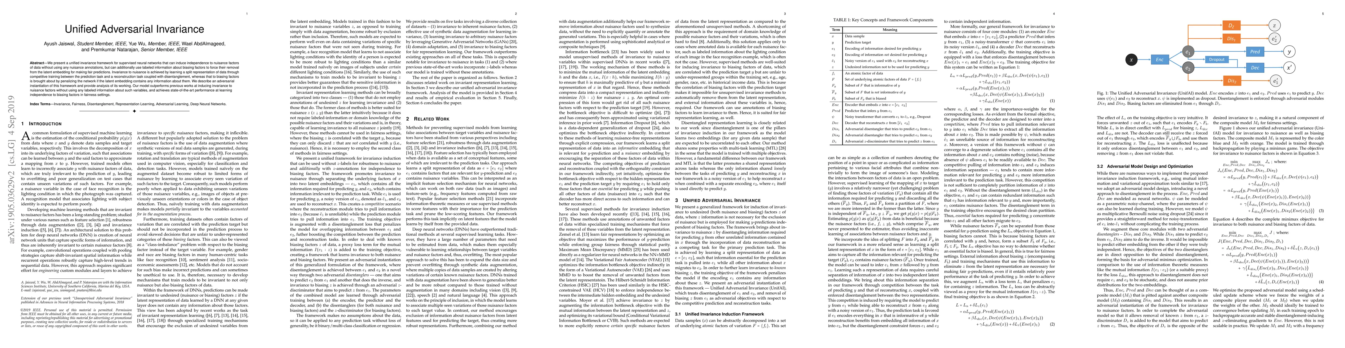 We present a unified invariance framework for supervised neural networks that can induce independence to nuisance factors of data without using any nuisance annotations, but can additionally use labeled information about biasing factors to force their removal from the latent embedding for making fair predictions. Invariance to nuisance is achieved by learning a split representation of data through competitive training between the prediction task and a reconstruction task coupled with disentanglement, whereas that to biasing factors is brought about by penalizing the network if the latent embedding contains any information about them. We describe an adversarial instantiation of this framework and provide analysis of its working. Our model outperforms previous works at inducing invariance to nuisance factors without using any labeled information about such variables, and achieves state-of-the-art performance at learning independence to biasing factors in fairness settings.