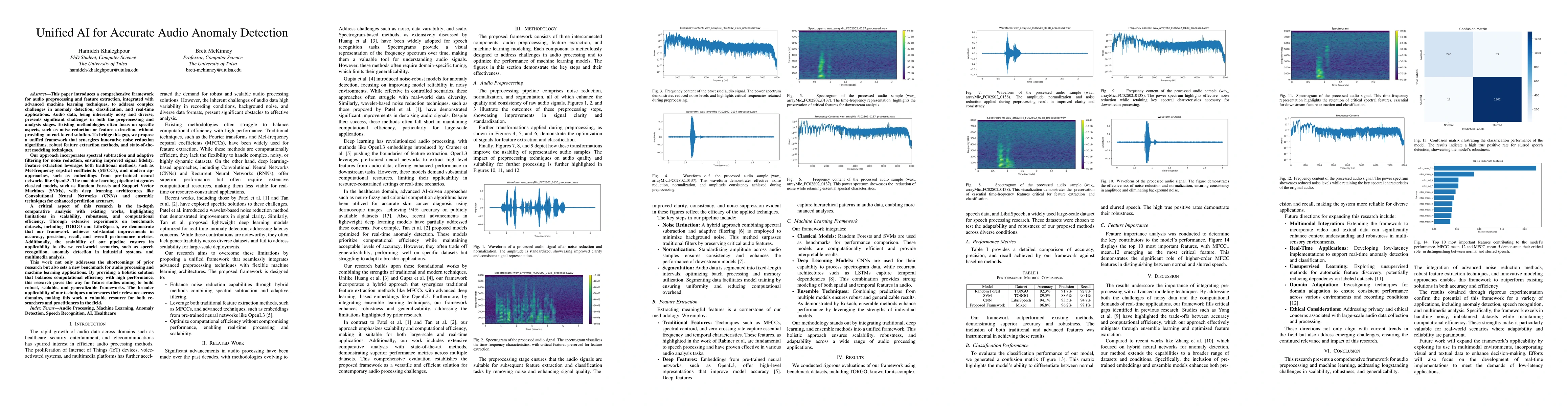 This paper presents a unified AI framework for accurate audio anomaly detection that combines noise reduction, feature extraction, and machine learning modeling techniques to boost robustness and accuracy in noisy environments.
