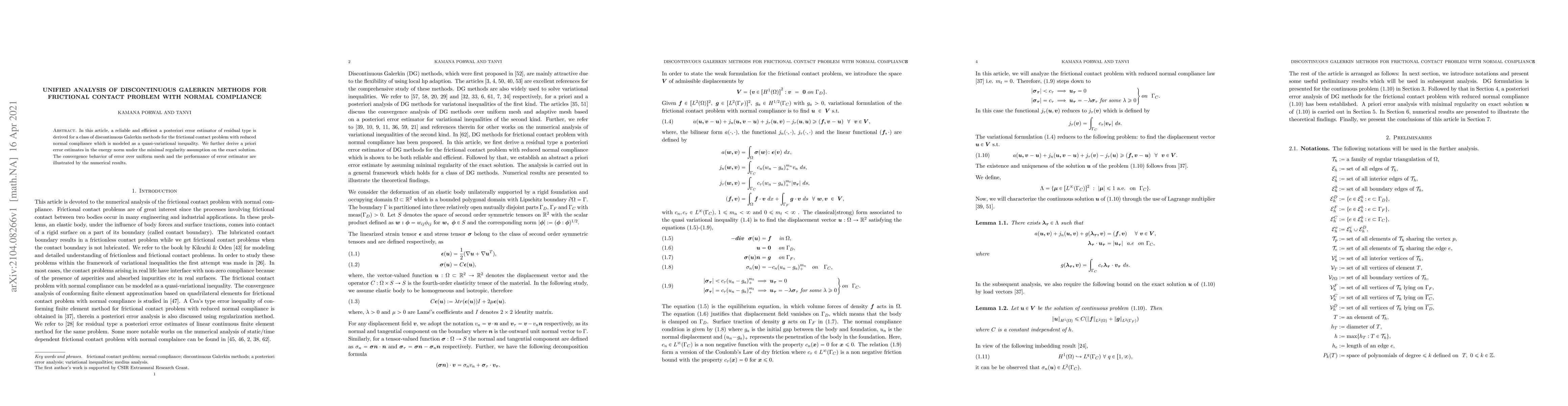 This paper presents a reliable a posteriori error estimator for discontinuous Galerkin methods applied to the frictional contact problem with reduced normal compliance, modeled as a quasi-variational inequality. It also provides a priori error estimates and demonstrates convergence and estimator performance through numerical results.