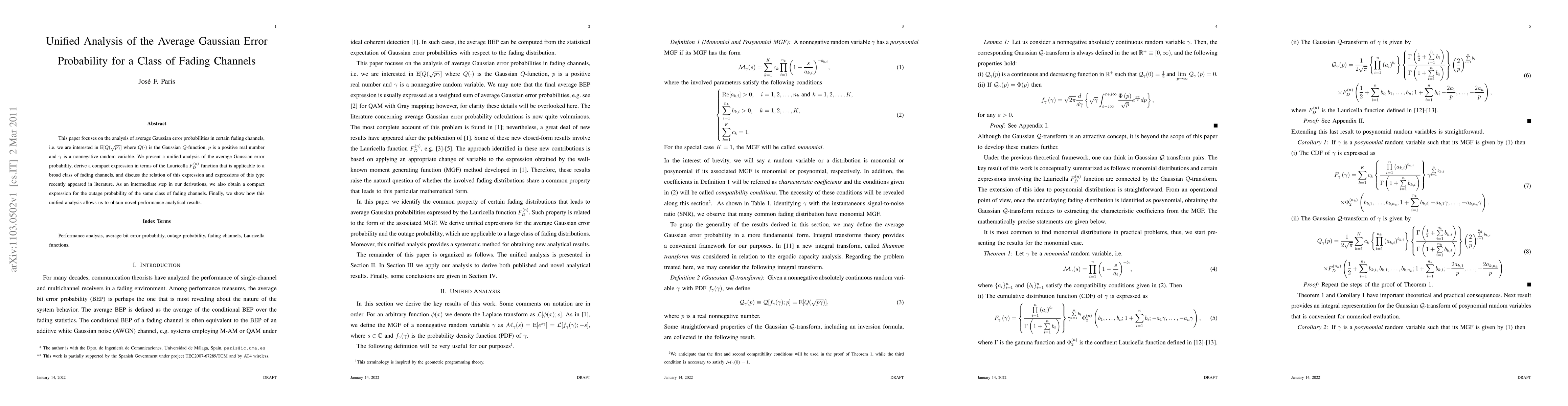This paper provides a unified analysis of average Gaussian error probabilities in various fading channels, deriving a compact expression using the Lauricella FD^(n) function. It also presents a new expression for outage probability and demonstrates novel performance analytical results.