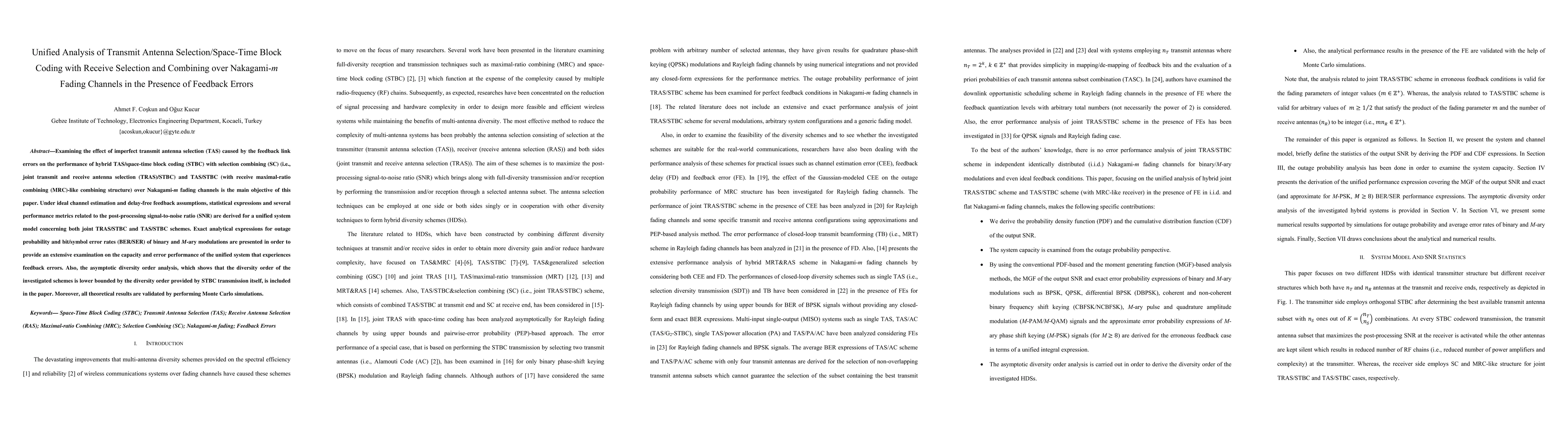 This paper analyzes the performance of hybrid transmit antenna selection (TAS)/space-time block coding (STBC) systems under feedback errors, deriving statistical expressions and performance metrics for both joint transmit and receive antenna selection (TRAS)/STBC and TAS/STBC schemes over Nakagami-m fading channels. It provides exact analytical expressions for outage probability and error rates, and validates the theoretical results with Monte Carlo simulations.