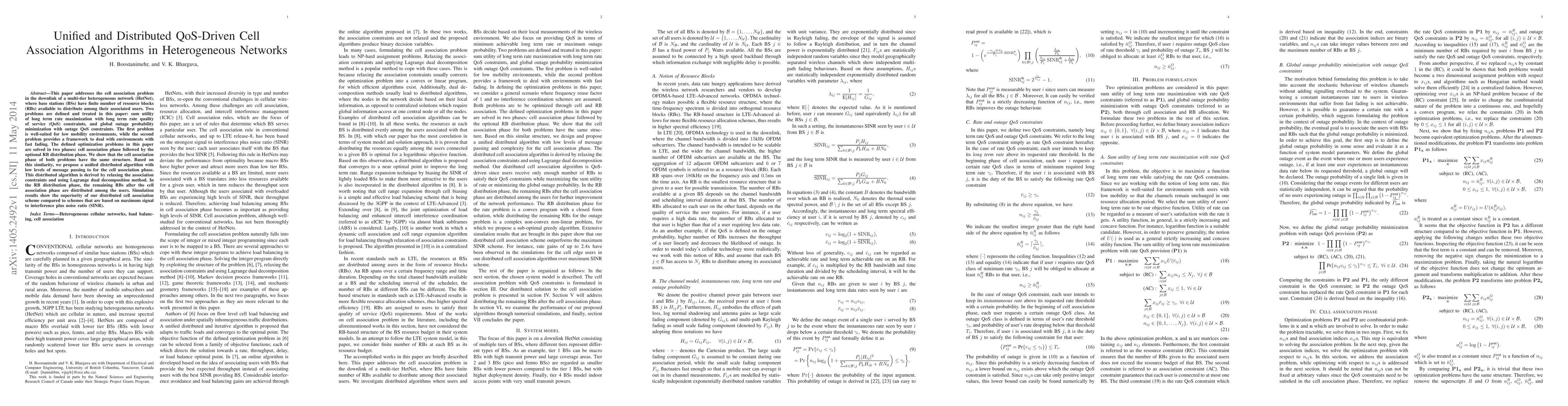This paper proposes unified and distributed algorithms for cell association in multi-tier heterogeneous networks, focusing on optimizing long-term rate and minimizing global outage probability under QoS constraints. The proposed distributed algorithm leverages Lagrange dual decomposition for efficient cell association, followed by resource block distribution, demonstrating superior performance compared to traditional SINR-based schemes.