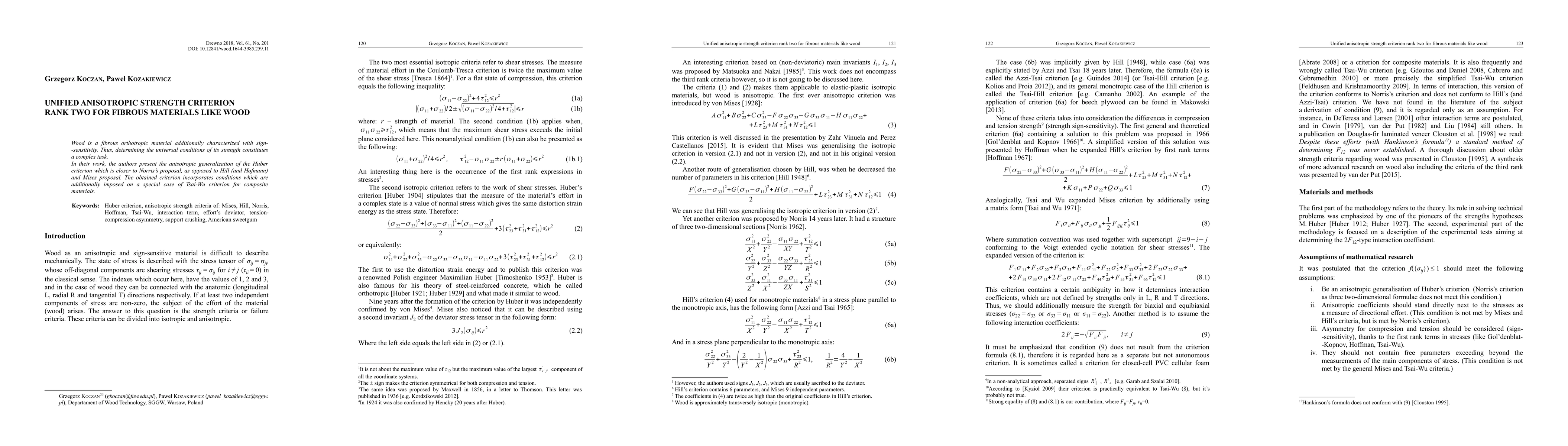 This paper presents an anisotropic strength criterion for fibrous orthotropic materials like wood, generalizing the Huber criterion to better reflect Norris's proposal. The new criterion also incorporates conditions from a special case of the Tsai-Wu criterion for composite materials.