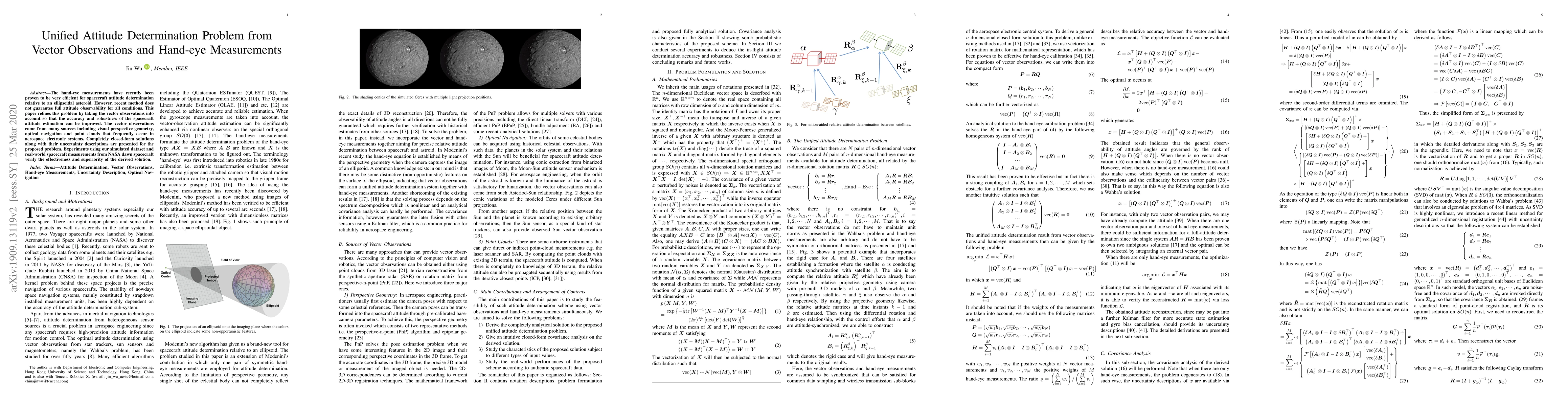This paper refines spacecraft attitude determination by integrating vector observations and hand-eye measurements, improving accuracy and robustness. It provides closed-form solutions with uncertainty descriptions, validated through simulations and real NASA Dawn spacecraft data.