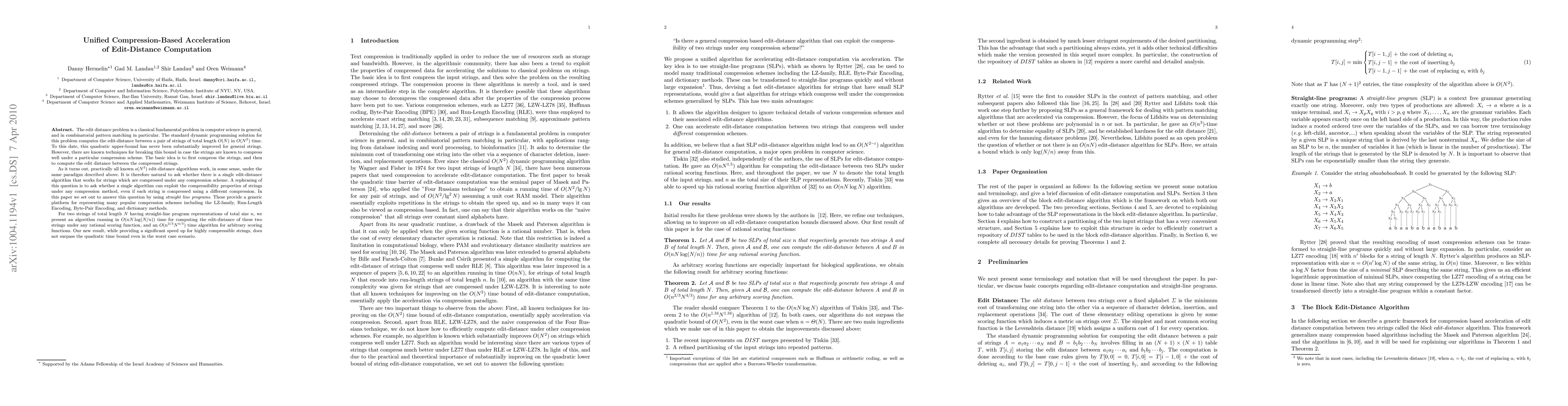 The edit distance problem is a classical fundamental problem in computer science in general, and in combinatorial pattern matching in particular. The standard dynamic programming solution for this problem computes the edit-distance between a pair of strings of total length O(N) in O(N^2) time. To this date, this quadratic upper-bound has never been substantially improved for general strings. However, there are known techniques for breaking this bound in case the strings are known to compress well under a particular compression scheme. The basic idea is to first compress the strings, and then to compute the edit distance between the compressed strings. As it turns out, practically all known o(N^2) edit-distance algorithms work, in some sense, under the same paradigm described above. It is therefore natural to ask whether there is a single edit-distance algorithm that works for strings which are compressed under any compression scheme. A rephrasing of this question is to ask whether a single algorithm can exploit the compressibility properties of strings under any compression method, even if each string is compressed using a different compression. In this paper we set out to answer this question by using straight line programs. These provide a generic platform for representing many popular compression schemes including the LZ-family, Run-Length Encoding, Byte-Pair Encoding, and dictionary methods. For two strings of total length N having straight-line program representations of total size n, we present an algorithm running in O(nN log(N/n)) time for computing the edit-distance of these two strings under any rational scoring function, and an O(n^{2/3}N^{4/3}) time algorithm for arbitrary scoring functions. Our new result, while providing a signi cant speed up for highly compressible strings, does not surpass the quadratic time bound even in the worst case scenario.
