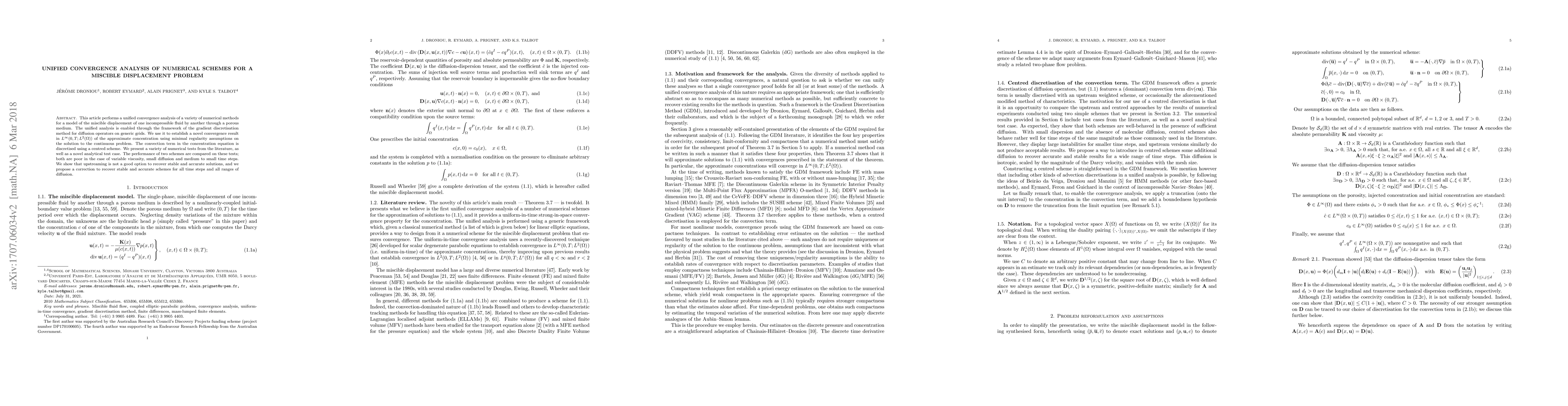 This article performs a unified convergence analysis of a variety of numerical methods for a model of the miscible displacement of one incompressible fluid by another through a porous medium. The unified analysis is enabled through the framework of the gradient discretisation method for diffusion operators on generic grids. We use it to establish a novel convergence result in $L^\infty(0,T; L^2(\Omega))$ of the approximate concentration using minimal regularity assumptions on the solution to the continuous problem. The convection term in the concentration equation is discretised using a centred scheme. We present a variety of numerical tests from the literature, as well as a novel analytical test case. The performance of two schemes are compared on these tests; both are poor in the case of variable viscosity, small diffusion and medium to small time steps. We show that upstreaming is not a good option to recover stable and accurate solutions, and we propose a correction to recover stable and accurate schemes for all time steps and all ranges of diffusion.