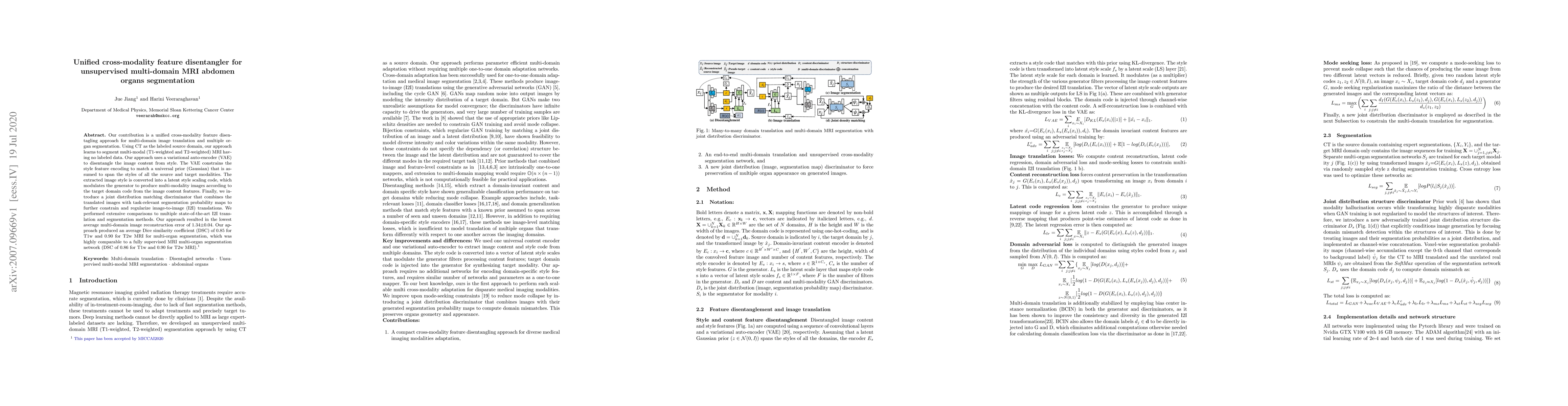 This paper presents a unified cross-modality feature disentangler using a variational auto-encoder for unsupervised multi-domain MRI abdomen organ segmentation, achieving a low reconstruction error and high segmentation accuracy comparable to fully supervised methods. The method translates CT images to unlabeled MRI modalities and segments multiple organs effectively.
