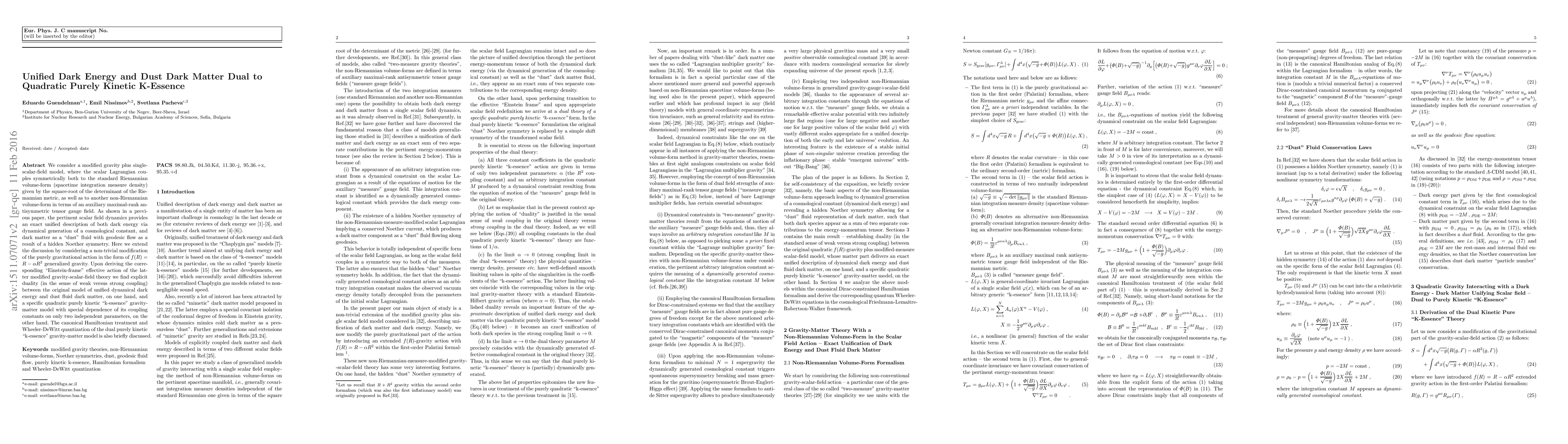 This paper explores a modified gravity model with a scalar field that symmetrically couples to both Riemannian and non-Riemannian volume-forms, providing a unified description of dark energy and dust dark matter. It extends the model to a generalized f(R) gravity framework and reveals a duality between the original unified model and a quadratic purely kinetic k-essence model.