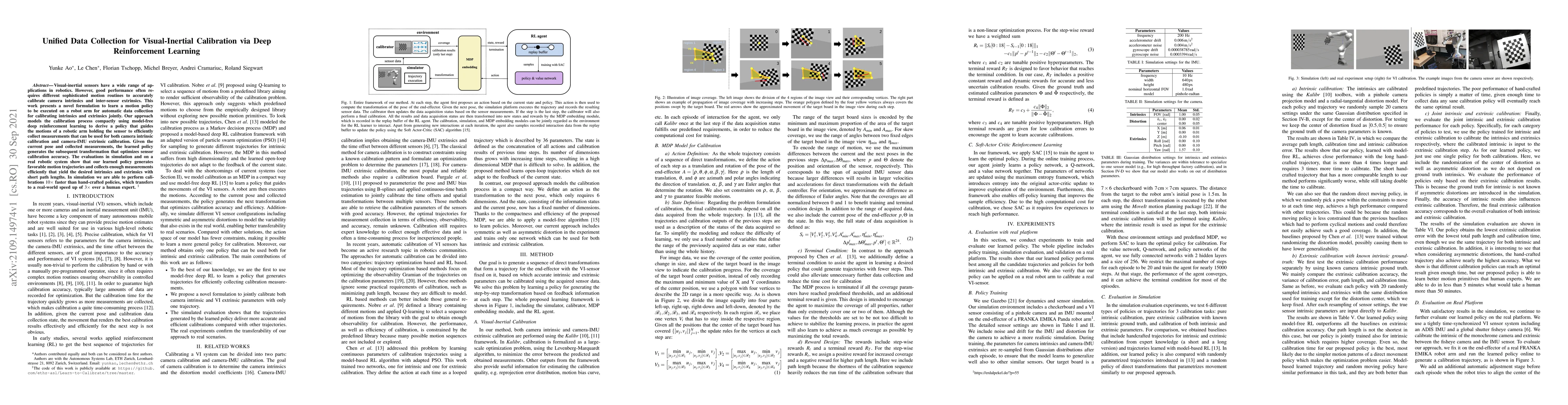 This paper proposes a deep reinforcement learning approach to automatically collect data for calibrating both camera intrinsics and inter-sensor extrinsics in visual-inertial systems using a robotic arm. The method learns an efficient motion policy that significantly speeds up calibration, achieving 10 times faster results in simulation and a 3 times speed up in real-world applications compared to traditional methods.