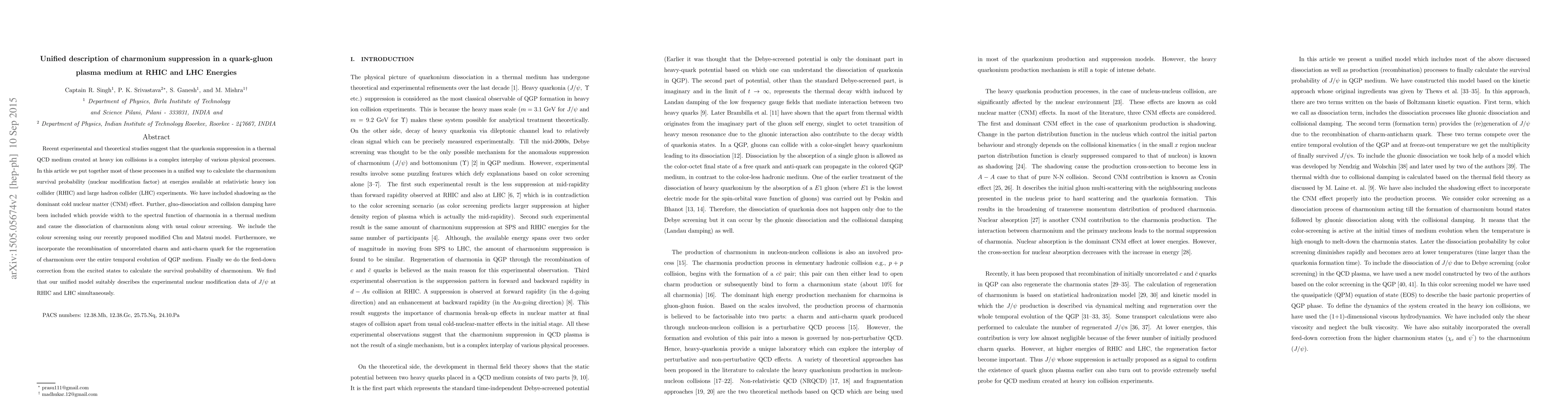 This paper presents a unified model to describe charmonium suppression in quark-gluon plasma at RHIC and LHC energies, incorporating shadowing, gluo-dissociation, collision damping, colour screening, and recombination effects. The model successfully explains the experimental nuclear modification data of $J/\psi$ at both collider energies.