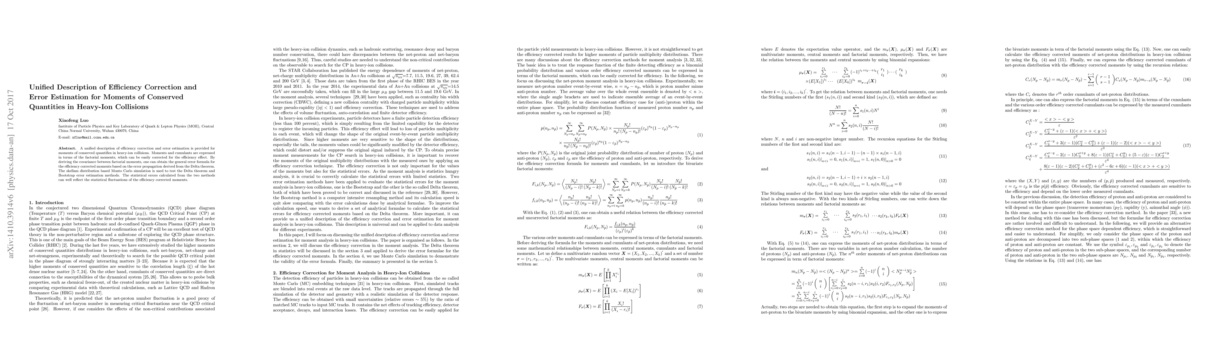 We provide a unified description of efficiency correction and error estimation for moments of conserved quantifies in heavy-ion collisions. Moments and cumulants are expressed in terms of the factorial moments, which can be easily corrected for the efficiency effect. By deriving the covariance between factorial moments, one can obtain the general error formula for the efficiency corrected moments based on the error propagation derived from the Delta theorem. The skellam distribution based Monto Carlo simulation is used to test the Delta theorem and Bootstrap error estimation methods. The statistical errors calculated from the two methods can well reflect the statistical fluctuations of the efficiency corrected moments.