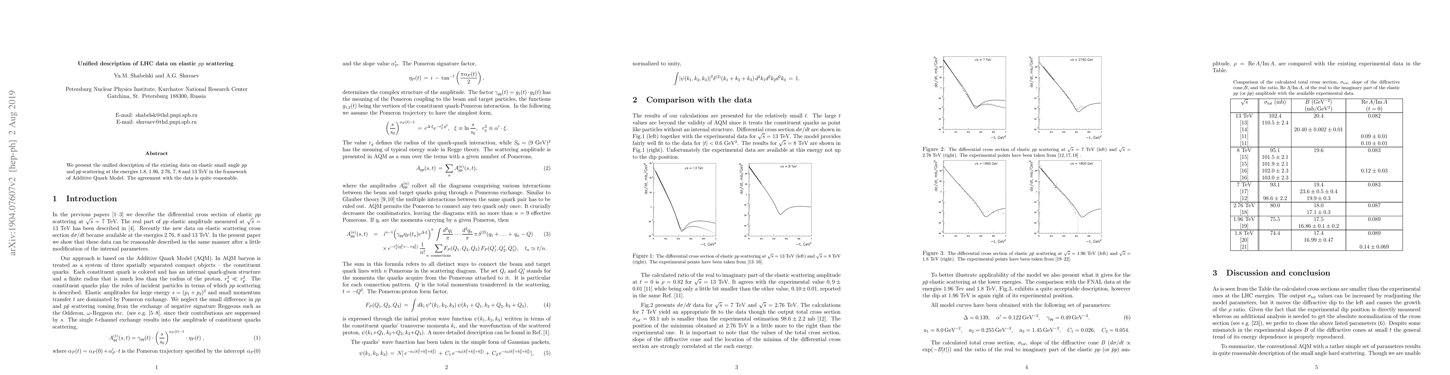 This paper provides a unified description of LHC data on elastic $pp$ and $p \bar p$ scattering across various energies using the Additive Quark Model, achieving reasonable agreement with the observed data.