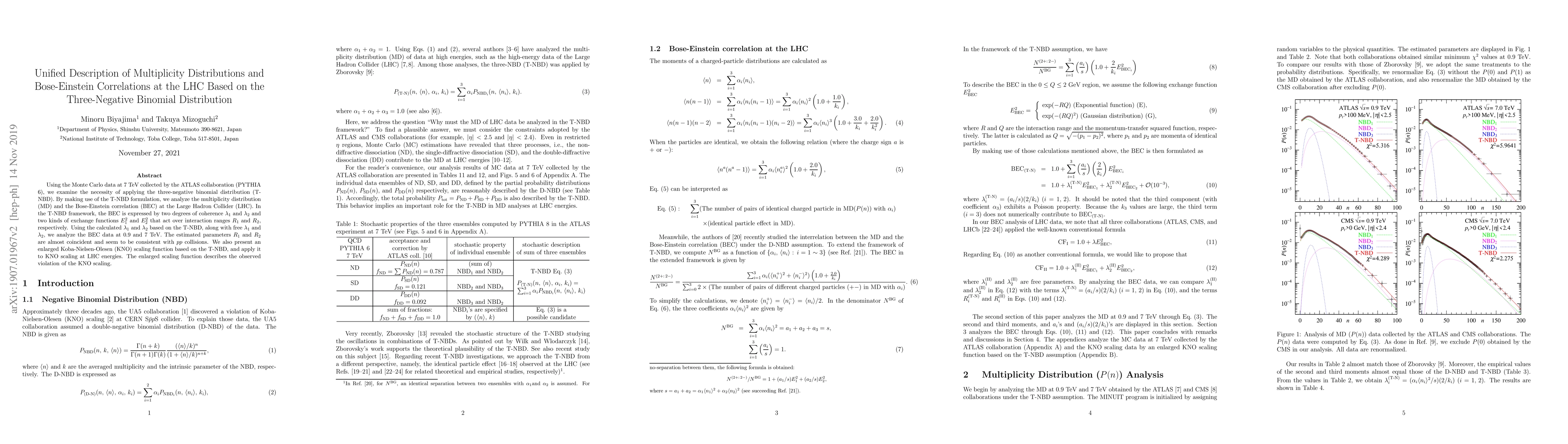 Using the Monte Carlo data at 7 TeV collected by the ATLAS collaboration (PYTHIA 6), we examine the necessity of applying the three-negative binomial distribution (T-NBD). By making use of the T-NBD formulation, we analyze the multiplicity distribution (MD) and the Bose-Einstein correlation (BEC) at the Large Hadron Collider (LHC). In the T-NBD framework, the BEC is expressed by two degrees of coherence $\lambda_1$ and $\lambda_2$ and two kinds of exchange functions $E_1^2$ and $E_2^2$ that act over interaction ranges $R_1$ and $R_2$, respectively. Using the calculated $\lambda_1$ and $\lambda_2$ based on the T-NBD, along with free $\lambda_1$ and $\lambda_2$, we analyze the BEC data at 0.9 and 7 TeV. The estimated parameters $R_1$ and $R_2$ are almost coincident and seem to be consistent with $pp$ collisions. We also present an enlarged Koba-Nielsen-Olesen (KNO) scaling function based on the T-NBD, and apply it to KNO scaling at LHC energies. The enlarged scaling function describes the observed violation of the KNO scaling.