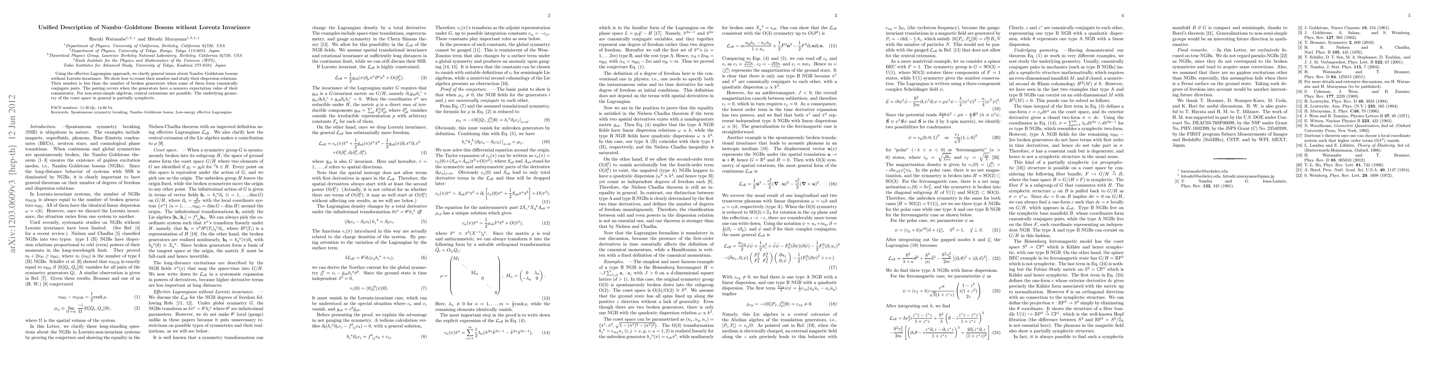 Using the effective Lagrangian approach, we clarify general issues about Nambu-Goldstone bosons without Lorentz invariance. We show how to count their number and study their dispersion relations. Their number is less than the number of broken generators when some of them form canonically conjugate pairs. The pairing occurs when the generators have a nonzero expectation value of their commutator. For non-semi-simple algebras, central extensions are possible. The underlying geometry of the coset space in general is partially symplectic.