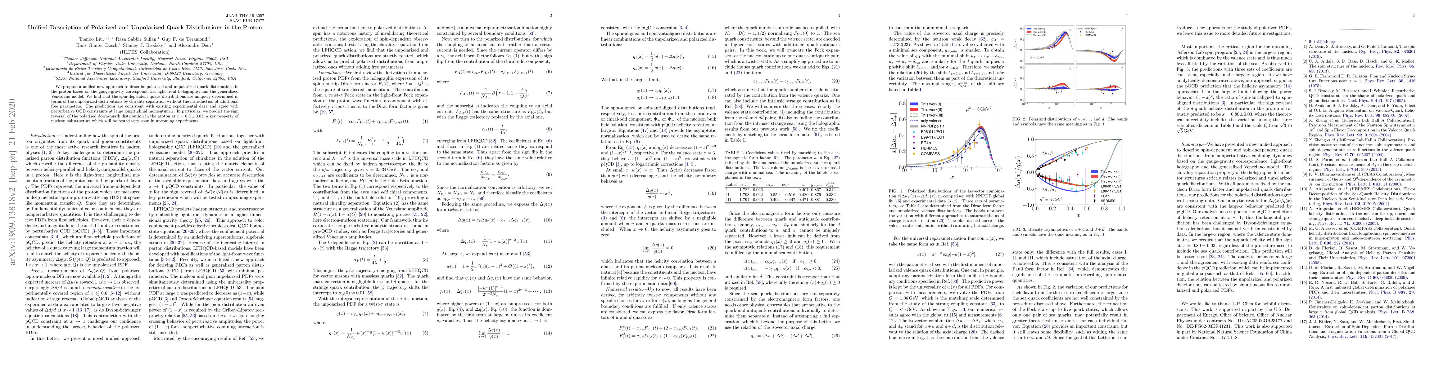 We propose a unified new approach to describe polarized and unpolarized quark distributions in the proton based on the gauge-gravity correspondence, light-front holography, and the generalized Veneziano model. We find that the spin-dependent quark distributions are uniquely determined in terms of the unpolarized distributions by chirality separation without the introduction of additional free parameters. The predictions are consistent with existing experimental data and agree with perturbative QCD constraints at large longitudinal momentum $x$. In particular, we predict the sign reversal of the polarized down-quark distribution in the proton at $x=0.8\pm0.03$, a key property of nucleon substructure which will be tested very soon in upcoming experiments.