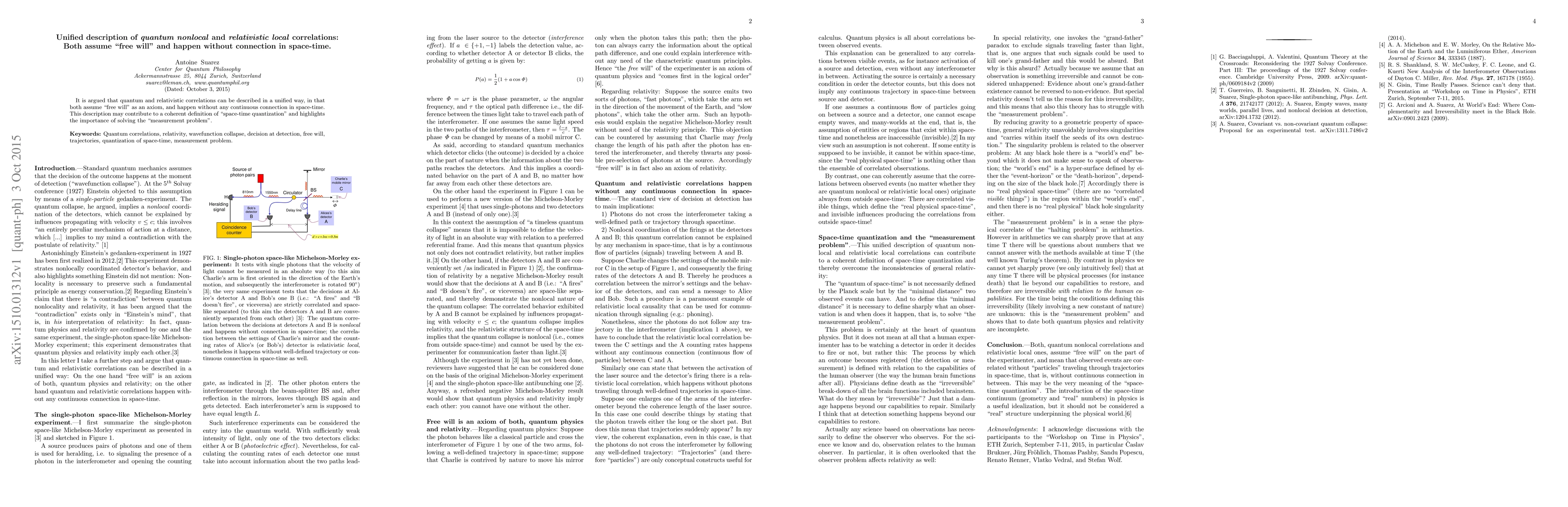 It is argued that quantum and relativistic correlations can be described in a unified way, in that both assume free will as an axiom, and happen without any continuous connection in space-time. This description may contribute to a coherent definition of "space-time quantization" and highlights the importance of solving the "measurement problem".