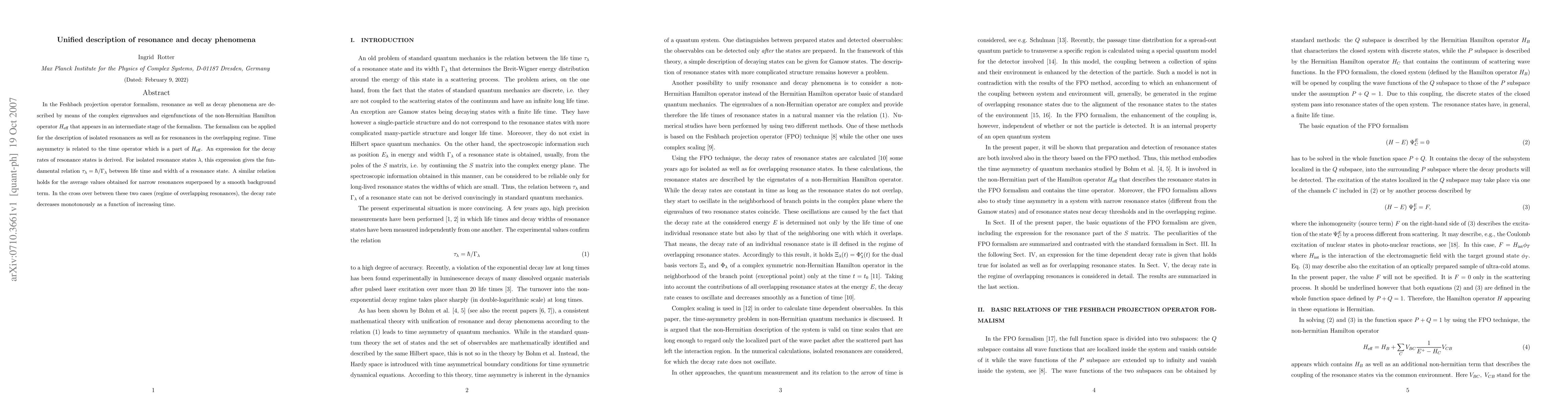 In the Feshbach projection operator formalism, resonance as well as decay phenomena are described by means of the complex eigenvalues and eigenfunctions of the non-Hermitian Hamilton operator $H_{\rm eff}$ that appears in an intermediate stage of the formalism. The formalism can be applied for the description of isolated resonances as well as for resonances in the overlapping regime. Time asymmetry is related to the time operator which is a part of $H_{\rm eff}$. An expression for the decay rates of resonance states is derived. For isolated resonance states $\lambda$, this expression gives the fundamental relation $\tau_\lambda = \hbar / \Gamma_\lambda$ between life time and width of a resonance state. A similar relation holds for the average values obtained for narrow resonances superposed by a smooth background term. In the cross over between these two cases (regime of overlapping resonances), the decay rate decreases monotonously as a function of increasing time.