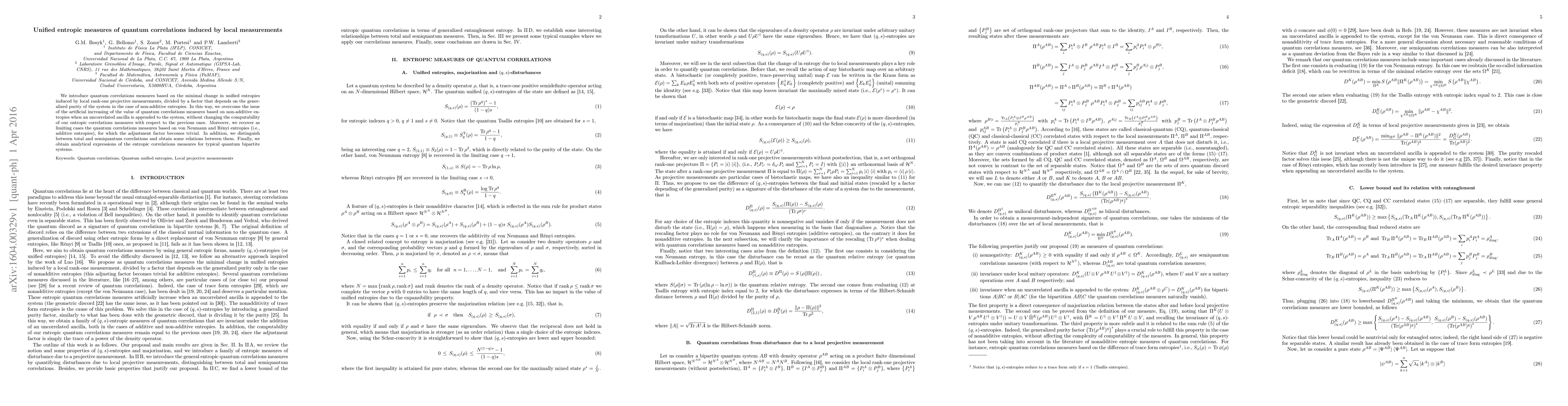This paper introduces new measures for quantum correlations based on the minimal change in unified entropies from local measurements, addressing the issue of artificially increased values when an uncorrelated ancilla is added. It also distinguishes between total and semiquantum correlations and provides analytical expressions for typical bipartite systems.