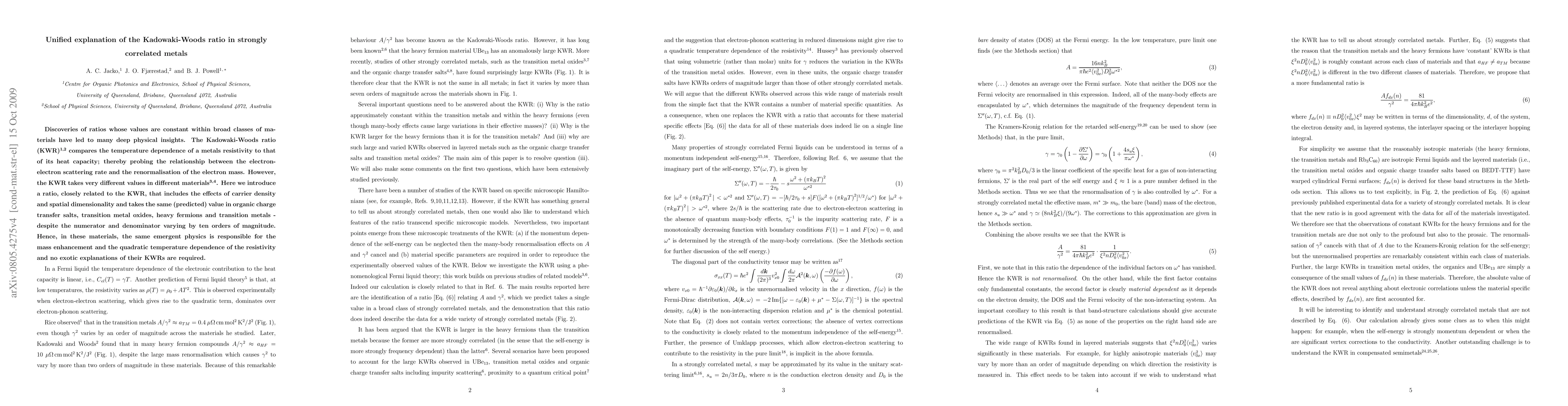 This paper proposes a unified explanation for the Kadowaki-Woods ratio in strongly correlated materials, showing that a related ratio consistently takes the same value across various classes of materials, indicating a common underlying physics despite large variations in resistivity and heat capacity.