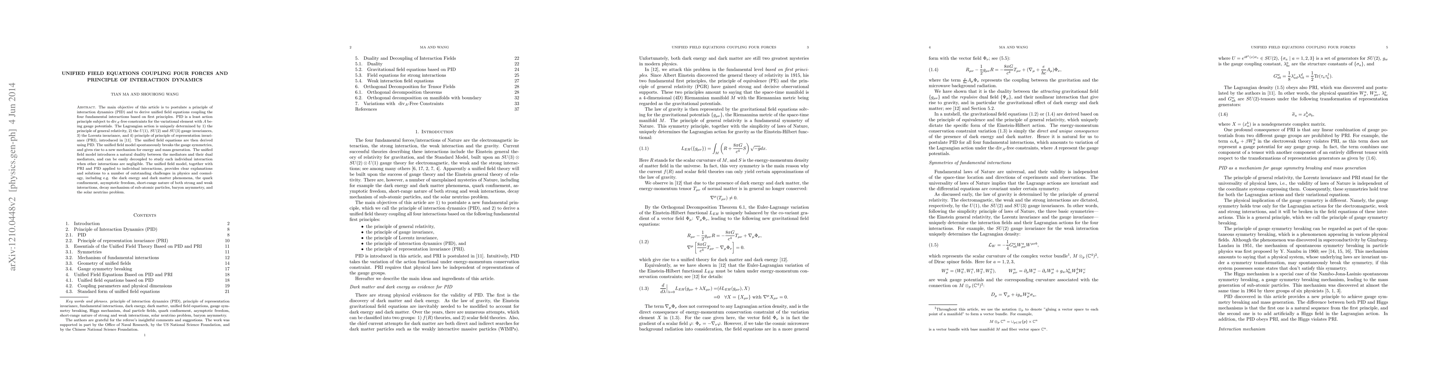 The main objective of this article is to postulate a principle of interaction dynamics (PID) and to derive unified field equations coupling the four fundamental interactions based on first principles. PID is a least action principle subject to div$_A$-free constraints for the variational element with $A$ being gauge potentials. The Lagrangian action is uniquely determined by 1) the principle of general relativity, 2) the $U(1)$, $SU(2)$ and $SU(3)$ gauge invariances, 3) the Lorentz invariance, and 4) principle of principle of representation invariance (PRI), introduced in [11]. The unified field equations are then derived using PID. The unified field model spontaneously breaks the gauge symmetries, and gives rise to a new mechanism for energy and mass generation. The unified field model introduces a natural duality between the mediators and their dual mediators, and can be easily decoupled to study each individual interaction when other interactions are negligible. The unified field model, together with PRI and PID applied to individual interactions, provides clear explanations and solutions to a number of outstanding challenges in physics and cosmology, including e.g. the dark energy and dark matter phenomena, the quark confinement, asymptotic freedom, short-range nature of both strong and weak interactions, decay mechanism of sub-atomic particles, baryon asymmetry, and the solar neutrino problem.