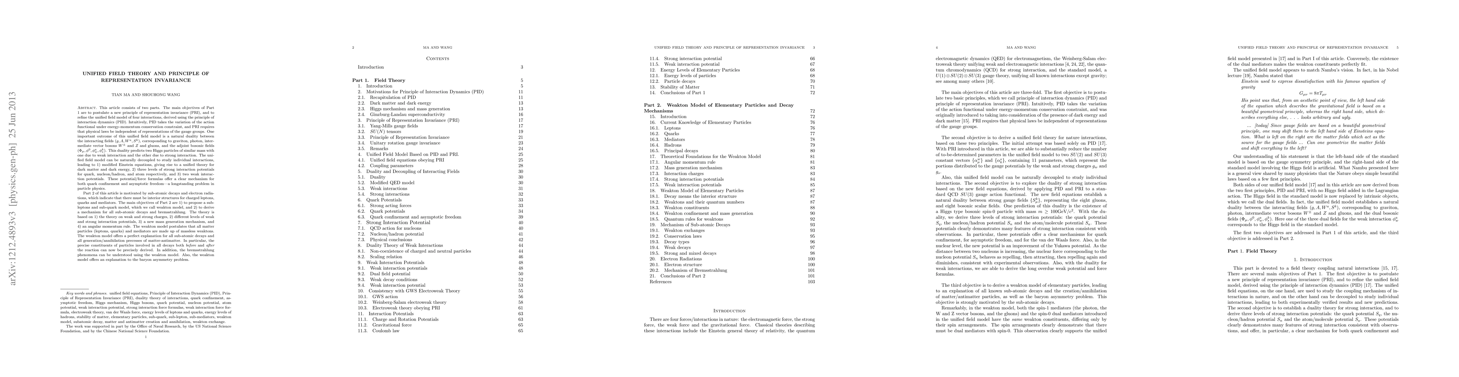 This article consists of two parts. The main objectives of Part 1 are to postulate a new principle of representation invariance (PRI), and to refine the unified field model of four interactions, derived using the principle of interaction dynamics (PID). Intuitively, PID takes the variation of the action functional under energy-momentum conservation constraint, and PRI requires that physical laws be independent of representations of the gauge groups. One important outcome of this field model is a natural duality between the interacting fields and the adjoint bosonic fields. This duality predicts two Higgs particles of similar mass with one due to weak interaction and the other due to strong interaction. The field model can be naturally decoupled to study individual interactions, leading to 1) modified Einstein equations, giving rise to a unified theory for dark matter and dark energy, 2) three levels of strong interaction potentials for quark, nucleon/hadron, and atom respectively, and 3) two weak interaction potentials. These potential/force formulas offer a clear mechanism for both quark confinement and asymptotic freedom. The main objectives of Part 2 are 1) to propose a sub-leptons and sub-quark model, which we call weakton model, and 2) to derive a mechanism for all sub-atomic decays and bremsstrahlung. The weakton model postulates that all matter particles and mediators are made up of massless weaktons. The weakton model offers a perfect explanation for all sub-atomic decays and all generation/annihilation precesses of matter-antimatter. In particular, the precise constituents of particles involved in all decays both before and after the reaction can now be precisely derived. In addition, the bremsstrahlung phenomena can be understood using the weakton model. Also, the weakton model offers an explanation to the baryon asymmetry problem.
