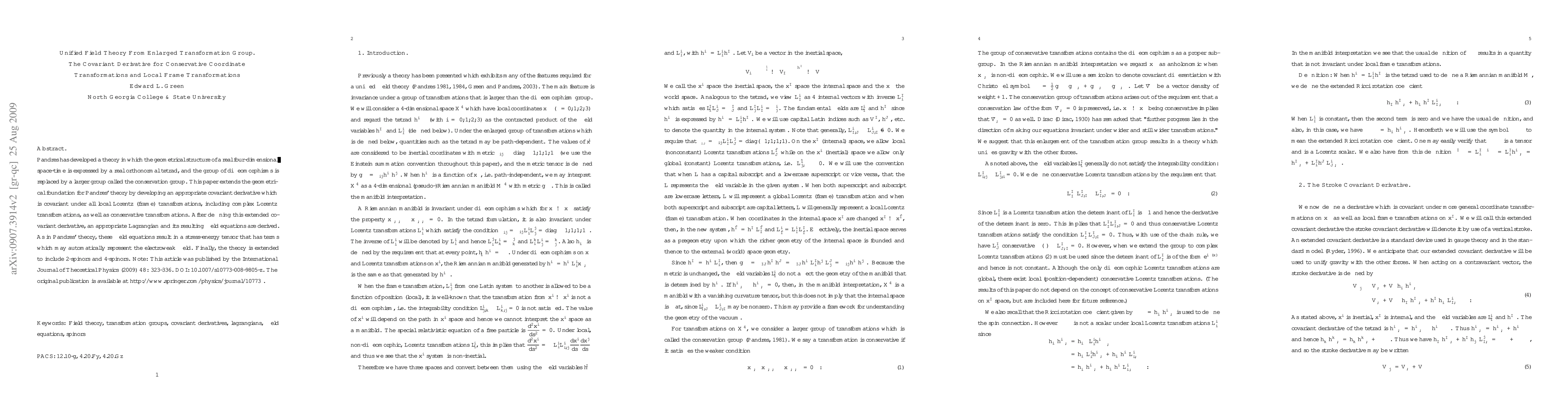 Pandres has developed a theory in which the geometrical structure of a real four-dimensional space-time is expressed by a real orthonormal tetrad, and the group of diffeomorphisms is replaced by a larger group called the conservation group. This paper extends the geometrical foundation for Pandres' theory by developing an appropriate covariant derivative which is covariant under all local Lorentz (frame) transformations, including complex Lorentz transformations, as well as conservative transformations. After defining this extended covariant derivative, an appropriate Lagrangian and its resulting field equations are derived. As in Pandres' theory, these field equations result in a stress-energy tensor that has terms which may automatically represent the electroweak field. Finally, the theory is extended to include 2-spinors and 4-spinors.