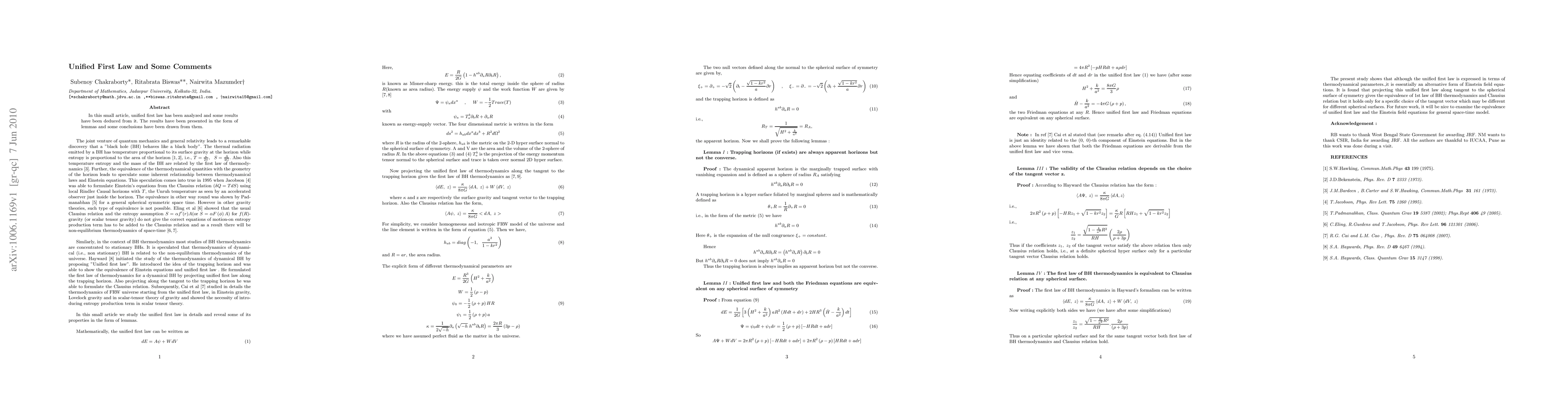 In this small article, unified first law has been analyzed and some results have been deduced from it. The results have been presented in the form of lemmas and some conclusions have been drawn from them.