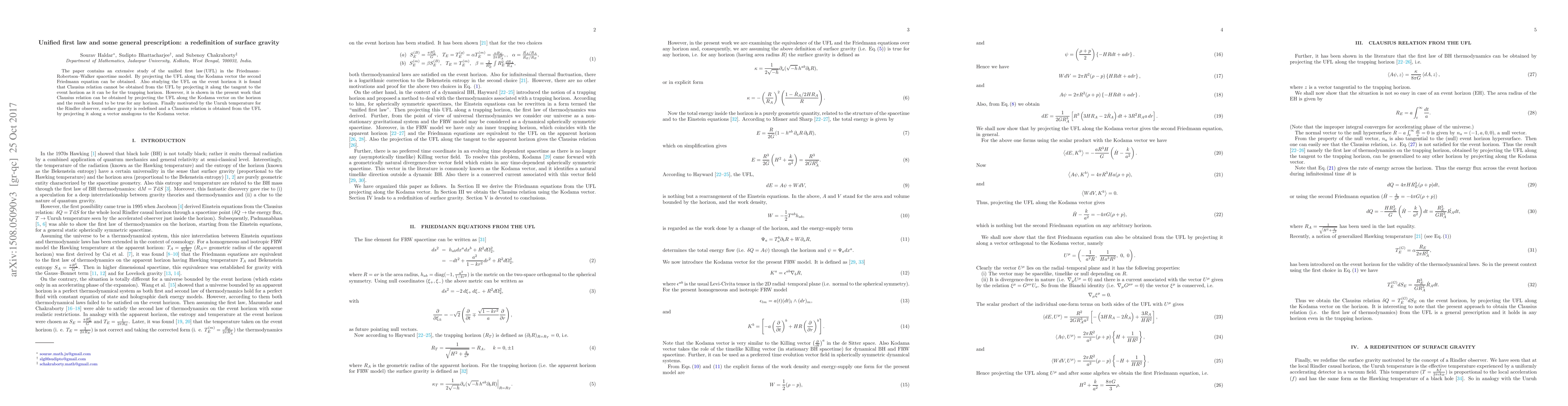 The paper contains an extensive study of the unified first law (UFL) in the Friedmann-Robertson-Walker spacetime model. By projecting the UFL along the Kodama vector the second Friedmann equation can be obtained. Also studying the UFL on the event horizon it is found that Clausius relation cannot be obtained from the UFL by projecting it along the tangent to the event horizon as it can be for the trapping horizon. However, it is shown in the present work that Clausius relation can be obtained by projecting the UFL along the Kodama vector on the horizon and the result is found to be true for any horizon. Finally motivated by the Unruh temperature for the Rindler observer, surface gravity is redefined and a Clausius relation is obtained from the UFL by projecting it along a vector analogous to the Kodama vector.