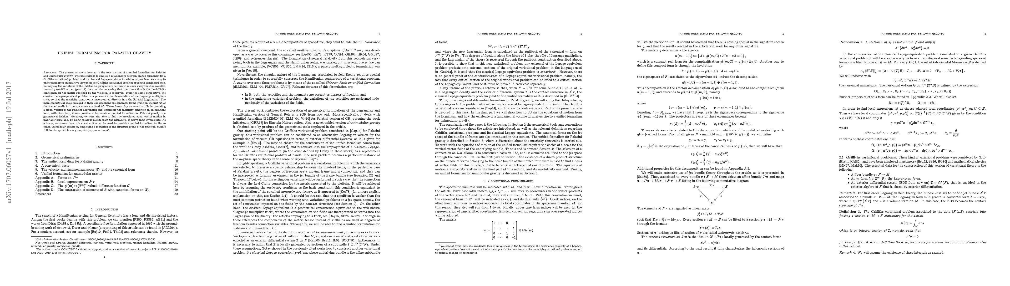 The present article is devoted to the construction of a unified formalism for Palatini and unimodular gravity. The basic idea is to employ a relationship between unified formalism for a Griffiths variational problem and its classical Lepage-equivalent variational problem. As a way to understand from an intuitive viewpoint the Griffiths variational problem approach considered here, we may say the variations of the Palatini Lagrangian are performed in such a way that the so called metricity condition, i.e. (part of) the condition ensuring that the connection is the Levi-Civita connection for the metric specified by the vielbein, is preserved. From the same perspective, the classical Lepage-equivalent problem is a geometrical implementation of the Lagrange multipliers trick, so that the metricity condition is incorporated directly into the Palatini Lagrangian. The main geometrical tools involved in these constructions are canonical forms living on the first jet of the frame bundle for the spacetime manifold $M$. These forms play an essential r\^ole in providing a global version of the Palatini Lagrangian and expressing the metricity condition in an invariant form; with their help, it was possible to formulate an unified formalism for Palatini gravity in a geometrical fashion. Moreover, we were also able to find the associated equations of motion in invariant terms and, by using previous results from the literature, to prove their involutivity. As a bonus, we showed how this construction can be used to provide a unified formalism for the so called unimodular gravity by employing a reduction of the structure group of the principal bundle $LM$ to the special linear group $SL\left(m\right),m=\mathop{\text{dim}}{M}$.