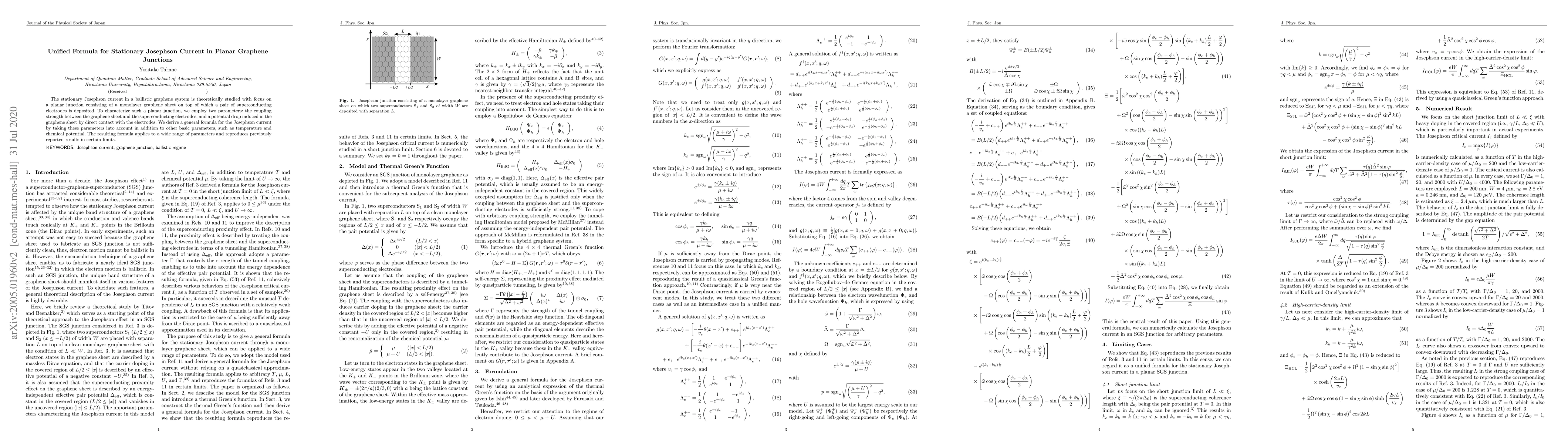 This paper derives a unified formula for the stationary Josephson current in planar graphene junctions, considering the coupling strength and potential drop between graphene and superconducting electrodes, alongside temperature and chemical potential. The formula is applicable across various parameter ranges and validates previous findings under specific conditions.
