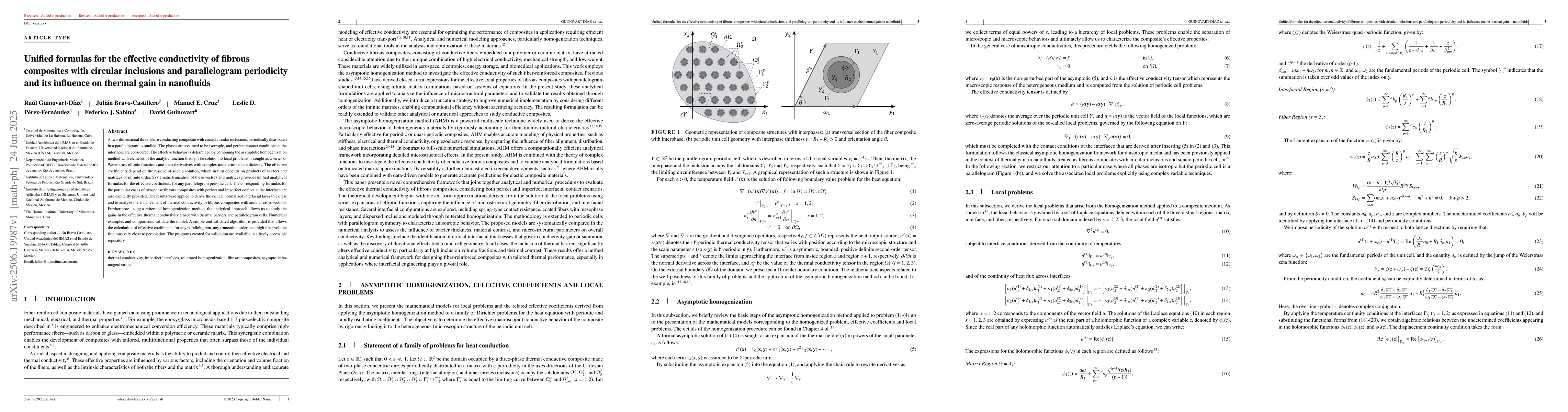A two-dimensional three-phase conducting composite with coated circular inclusions, periodically distributed in a parallelogram, is studied. The phases are assumed to be isotropic, and perfect contact conditions at the interfaces are considered. The effective behavior is determined by combining the asymptotic homogenization method with elements of the analytic function theory. The solution to local problems is sought as a series of Weierstrass elliptic functions and their derivatives with complex undetermined coefficients. The effective coefficients depend on the residue of such a solution, which in turn depends on products of vectors and matrices of infinite order. Systematic truncation of these vectors and matrices provides unified analytical formulas for the effective coefficients for any parallelogram periodic cell. The corresponding formulas for the particular cases of two-phase fibrous composites with perfect and imperfect contact at the interface are also explicitly provided. The results were applied to derive the critical normalized interfacial layer thickness and to analyze the enhancement of thermal conductivity in fibrous composites with annular cross sections. Furthermore, using a reiterated homogenization method, the analytical approach allows us to study the gains in the effective thermal conductivity tensor with thermal barriers and parallelogram cells. Numerical examples and comparisons validate the model. A simple and validated algorithm is provided that allows the calculation of effective coefficients for any parallelogram, any truncation order, and high fiber volume fractions very close to percolation. The programs created for validation are available in a freely accessible repository.
