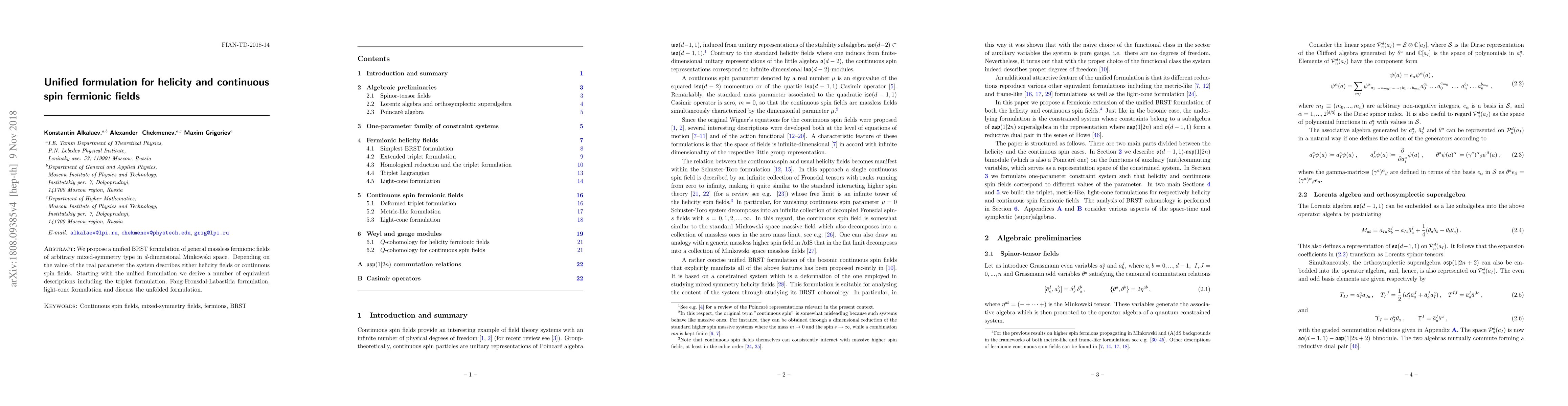 A unified BRST formulation for massless fermionic fields is proposed, allowing for both helicity and continuous spin field descriptions, with various equivalent formulations derived from the unified approach.