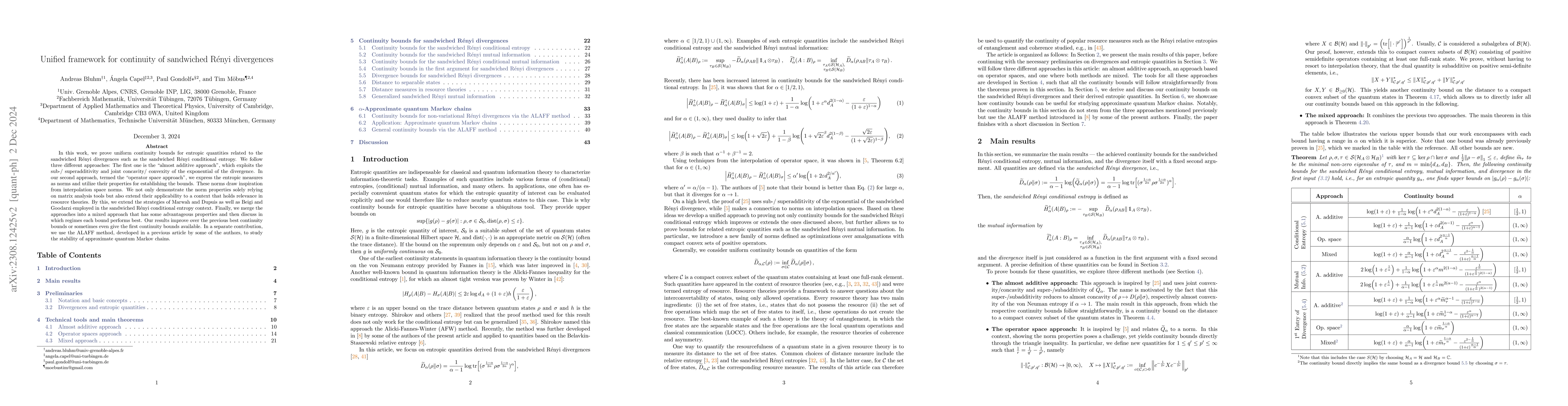 This paper establishes uniform continuity bounds for entropic measures related to sandwiched R\'enyi divergences using axiomatic, operator space, and mixed approaches. The results improve or provide the first continuity bounds, and the study also applies the ALAAF method to analyze the stability of approximate quantum Markov chains.